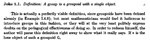 определение группы через группоид было бы нормальным, если бы оно было выделено в виде короткого замечания где-нибудь в конце в середине, ничего плохого в этой "шутке" нет, просто не надо с неё начинать главу и обильно размусоливать на целую страницу.