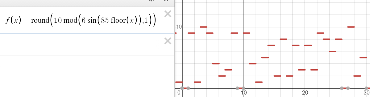 Есть функция, похожая на дискретный рандом. Как получить похожую, только чтобы еще длина полосочек тоже была "рандомной" от 1 до 10, например. Мне в голову пришло только, что хорошо бы иметь фунцию, как со второго пика, которая дискретно возрастает, а длина полосок случайная. С помощью нее можно было бы получить то что требуется из первой функции и другие функции случайно растягивать. Для любого x она должна выдавать результат за константное время и память.