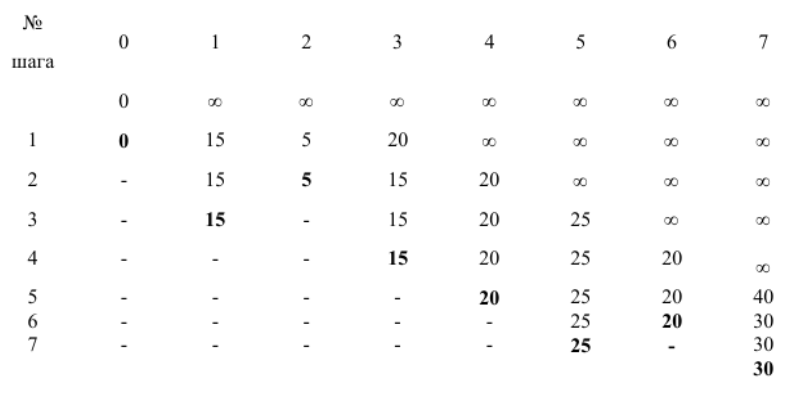 Задача: найти кратчайший путь от вершины 0 до вершины 7 с помощью алгоритма Дейкстры. Пик 1 - собственно, граф, пик 2 - таблица, построенная алгоритмом Дейкстры. Как построить эту таблицу я понимаю. Как по ней получить путь?
