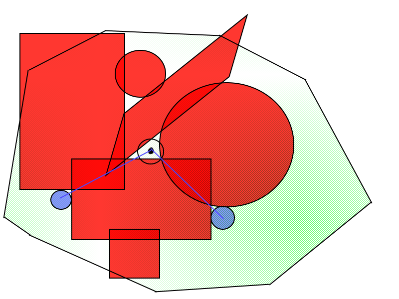 Есть практическая задача, не могу ее эффективно решить. Двухмерное пространство, есть два класса зон: разрешающие и запрещающие. Могут быть окружностью либо полигоном (выпуклым, пока). Задача - найти близжайшую окружность, которая будет полностью в допустимой зоне, при этом не будет пересекаться с запрещающими зонами, т.е. для точки в центре - одна из двух фиолетовых.