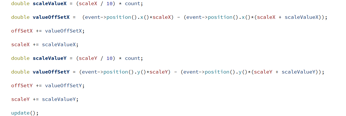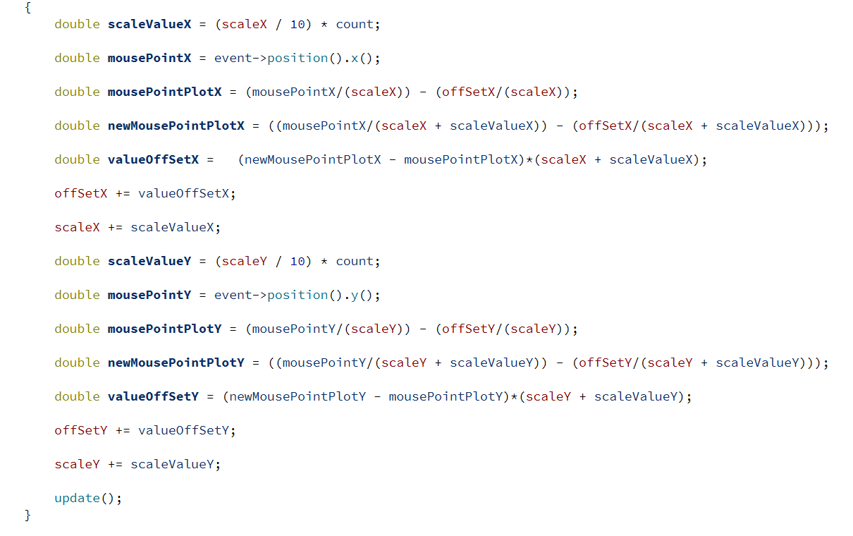 У меня задача, нужно график функции масштабировать и компенсировать смещение точки под курсором при масштабировании. Какой алгоритм мне использовать? я использую алгоритм следующий: [mаth]сдвиг графика по оси Х += (координаты мыши масштаб графика) - (координаты мыши новый масштаб графика) [/mаth]