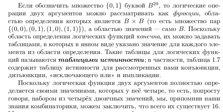 >>83192 >Мне понятно, что область определения состоит из 4ех пар нулей и единиц при n=2, а область значений это 1 и 0 Вот они у тебя вертикально и изображены. Конъюнкция это 0001 потому что таким образом перечислены варианты значений x1,x2 в заголовке 0 0 1 1 | 0 1 0 1 |<-- 4 пары нулей и единиц _____ 0 0 0 1 <-- 1 из 16 вариантов выбора для каждой пары 1 или 0