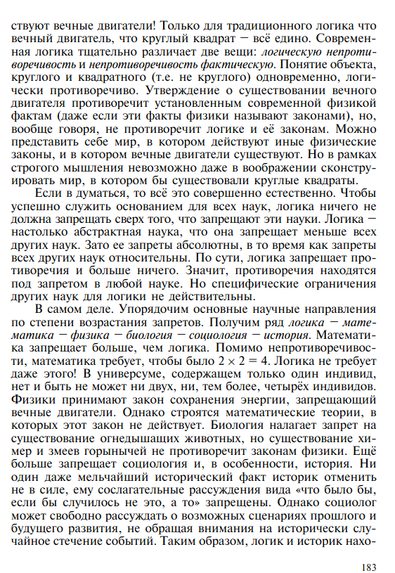 >>89654 Нет, во-первых, логик сильно больше, чем одна. Во-вторых, логика запрещает только противоречия. Например, круглый квадрат - противоречивое понятие, круглый квадрат логически невозможен. А вот вечный двигатель невозможен физически. Изучить по теме можно семантику возможных миров.