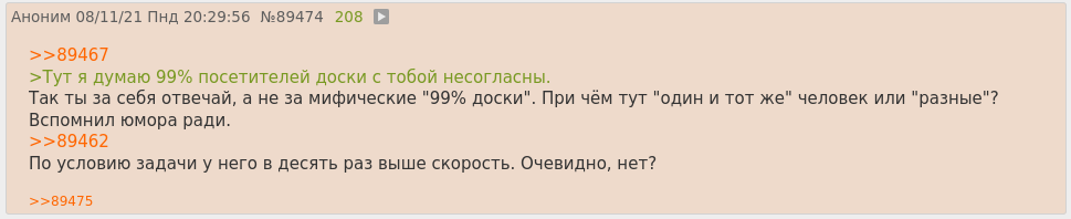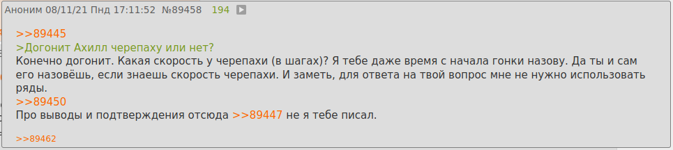 >>89839 >Пикрелейтед - это рассуждения того долбоёба, который не может понять, почему 0,(9)=1. Так ты докажи, долбаёб, что 0,(9)=1. Но такое хуило только может верещать, что "так принято". Принято таких уебанцев, как ты, вперёд ногами выносить на достойных диспутах. >Более тупой хуйни я не слышал. Так ты ещё и ёбнутый, раз при чтении что-то слышишь.