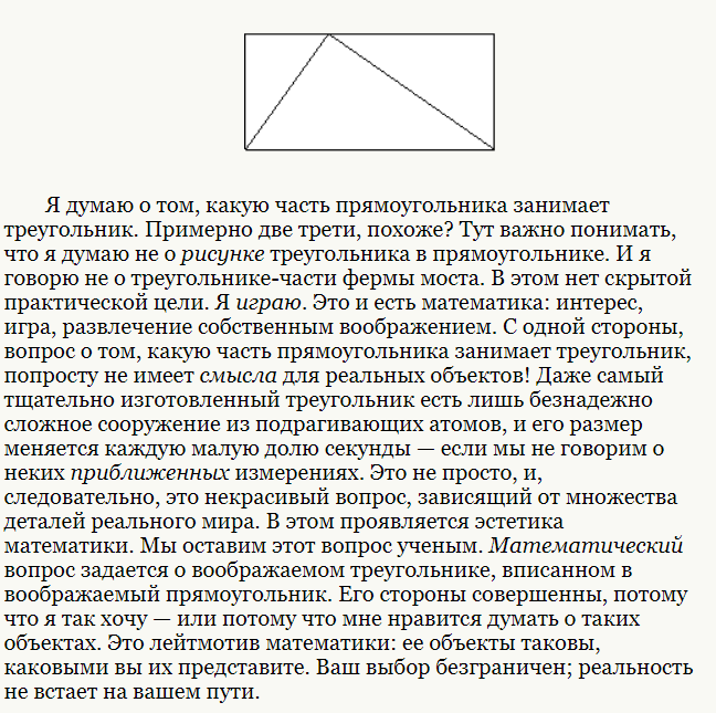 Философ А.Шопенгауэр считал математику довольно интересной наукой, но не имеющей никаких приложений, в том числе и в физике. Он даже отвергал саму технику строгих математических доказательств. Шопенгауэр называл их мышеловками и приводил в качестве примера доказательство известной теоремы Пифагора. Оно является, конечно, точным: никто не может счесть его ложным. Но оно представляет собой совершенно искусственный способ рассуждения. Каждый шаг его убедителен, однако к концу доказательства возникает чувство, что вы попали в мышеловку. Математик вынуждает вас допустить справедливость теоремы, но вы не получаете никакого реального понимания. Это все равно, как если бы вас провели через лабиринт. Вы наконец выходите из лабиринта и говорите себе: «Да, я вышел, но не знаю, как здесь очутился».
