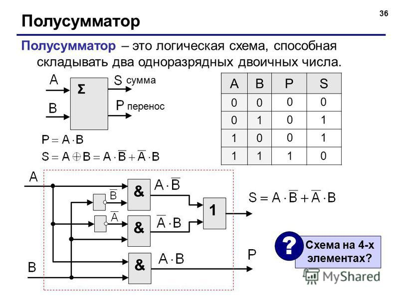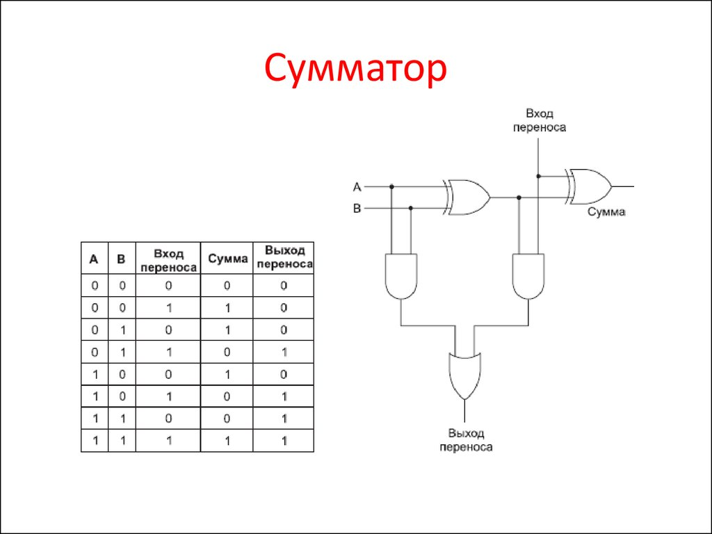 >>96891 Я придумал ещё более базированную шизотеорию. В схемотехнике есть такие штуки как сумматор и полусумматор, которые на основе операторов (функций) булевой алгебры реализуют сложение. А если сложение можно свести к булевой алгебре, то значит и все арифметические операции можно свести к булевой алгебре.