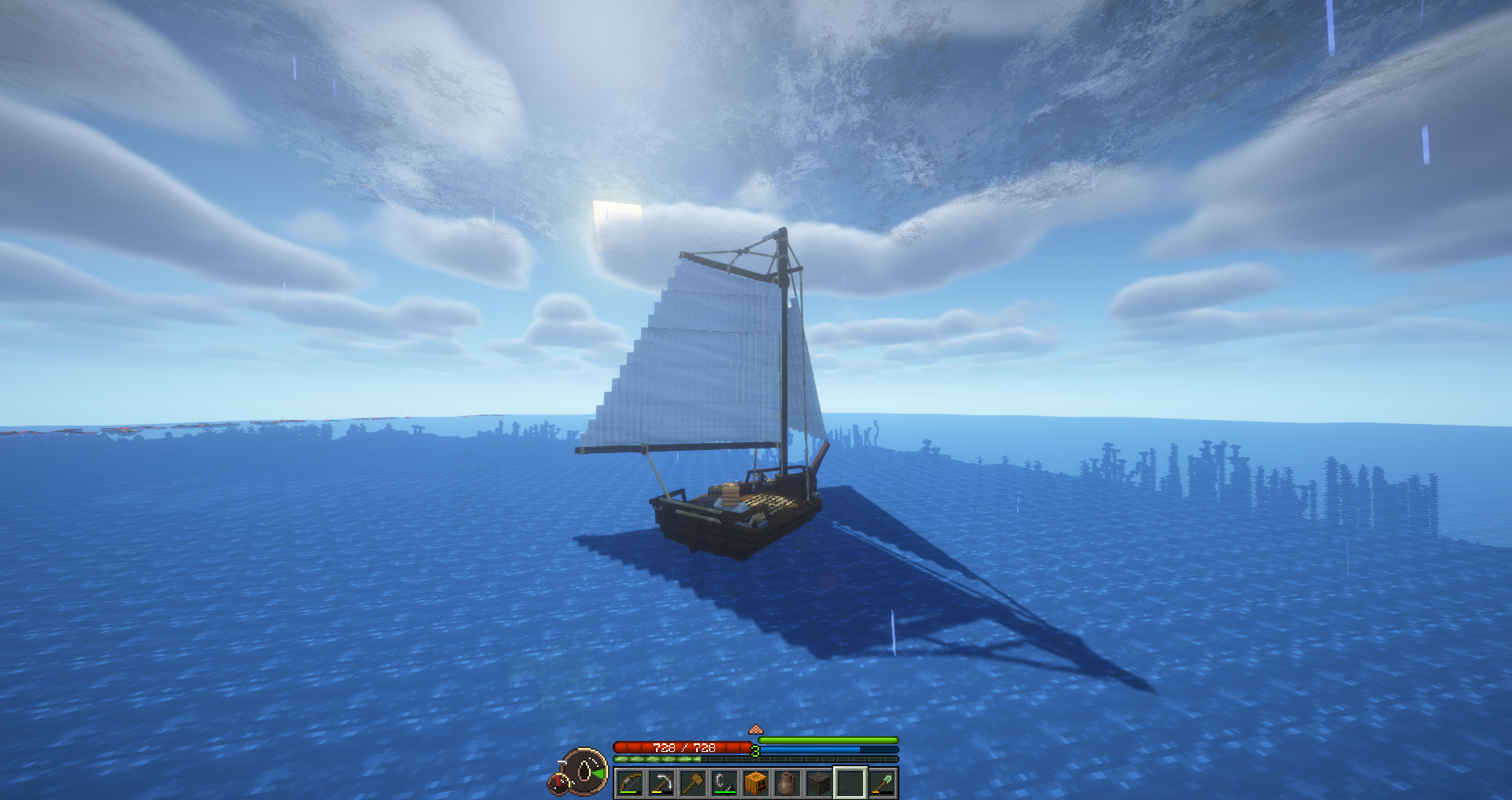 - Мореходство — ванильные лодки удалены. Теперь для плавания вам нужно своими руками создать настоящую лодку или каноэ. Главное — не забывать про вёсла, ведь в игре сильное течение на реках. Для океана можно построить парусный корабль, снабдить его пушками и сундуками и идти по ветру. Кстати, океаны здесь в разы больше, чем в ваниле.