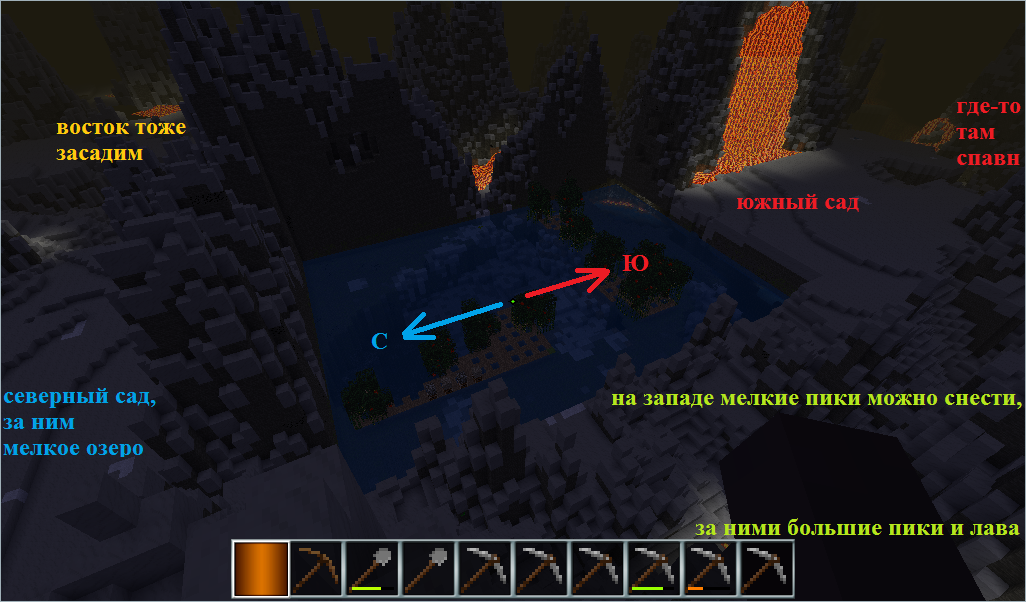 На севере за северным садом обнаружилось еще мелкое озеро. Тоже его расширил. Но прежде чем расширять, нужно было обезопасить от попадания потока лавы. Пошел убирать - копнул лишнего. Копнул лишнего - поглощаем бОльшим копком. Вощим сделал к этому мелкому озеру еще примыкающую ровную площадку, согласовав ее восточную сторону с восточным берегом большого озера. Так что и тут какой-то задел на будущее.