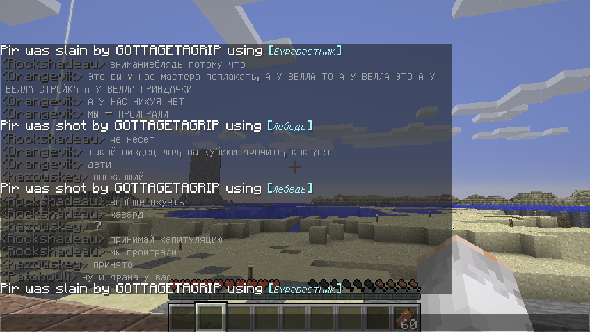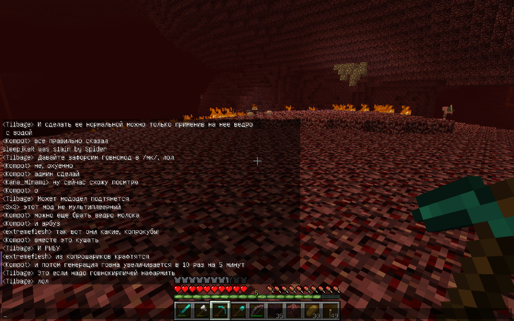 Здарова всем, кто-нибудь играл примерно в 11-12 -13 году на ХАРЧ СЕРВЕРЕ? (он был на этой доске), это был РП сервак с запретом гриферства, но больше всего мне доставляло, что там была фракция пустынников с пророком Сулейманом во главе и они поклонялись Херобрину как единственному богу, я участвовал в их джихаде один раз и мне доставило, что они даже на серваке с запретом гриферства скриптами умудрялись поднасрать врагам, так как кидали с высоты песок и он покрывал все собой + спаунили куриц яйцами, чтобы они под ногами мешались. Помню на этом серваке до его вайпа из-за пустынников всегда было весело, может у кого-то остались скрины или архивы тех тредов?