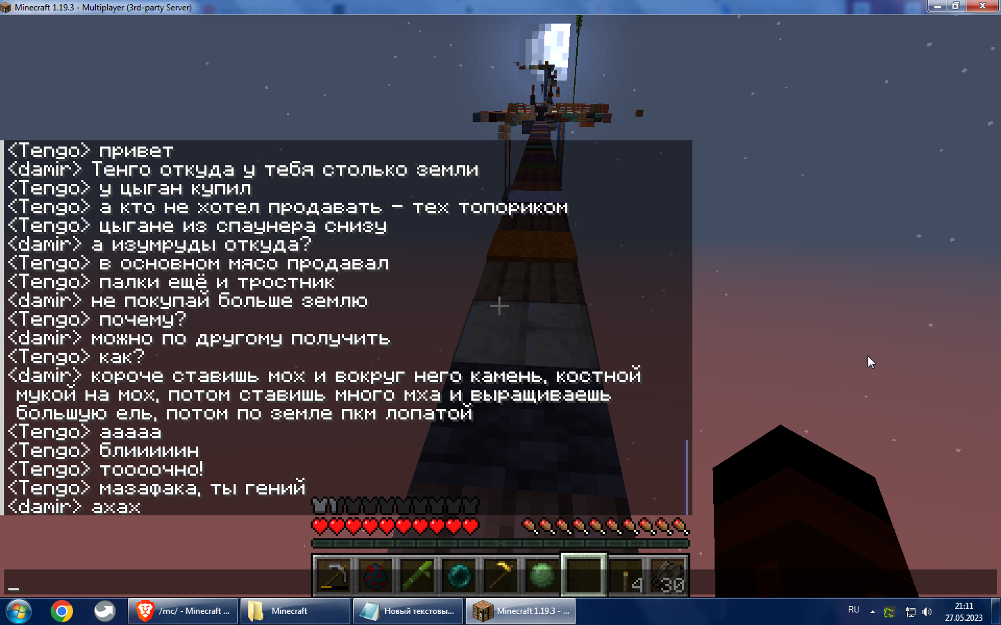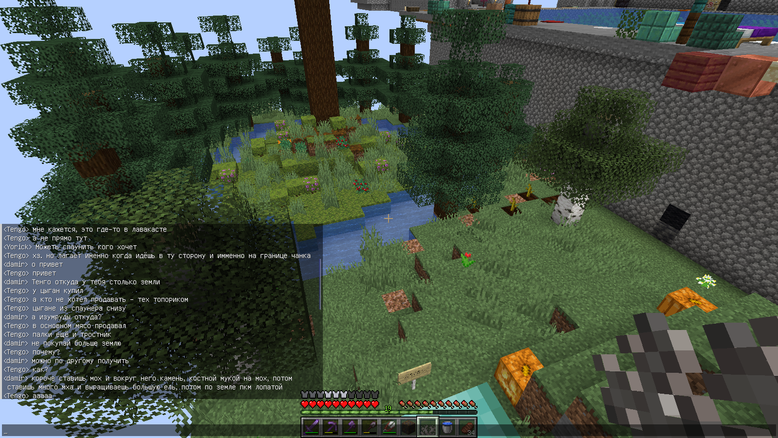 >>606118 Я тоже этот способ заскринил, чтобы не забыть. Ну и вообще ощущения были, как от откровения. Помню, как эту землю воровали и после использования хранили в эндерчесте. И по всему лавакасту с мостами и платформами нельзя было найти ни одного блока земли. Нет земли - нет пищи и дерева. Даже бассейн с ламинариями появился имено ради доступной (хоть и хреновой) еды. А тут такое. Срубил ёлку и вот тебе аж два стака земли.