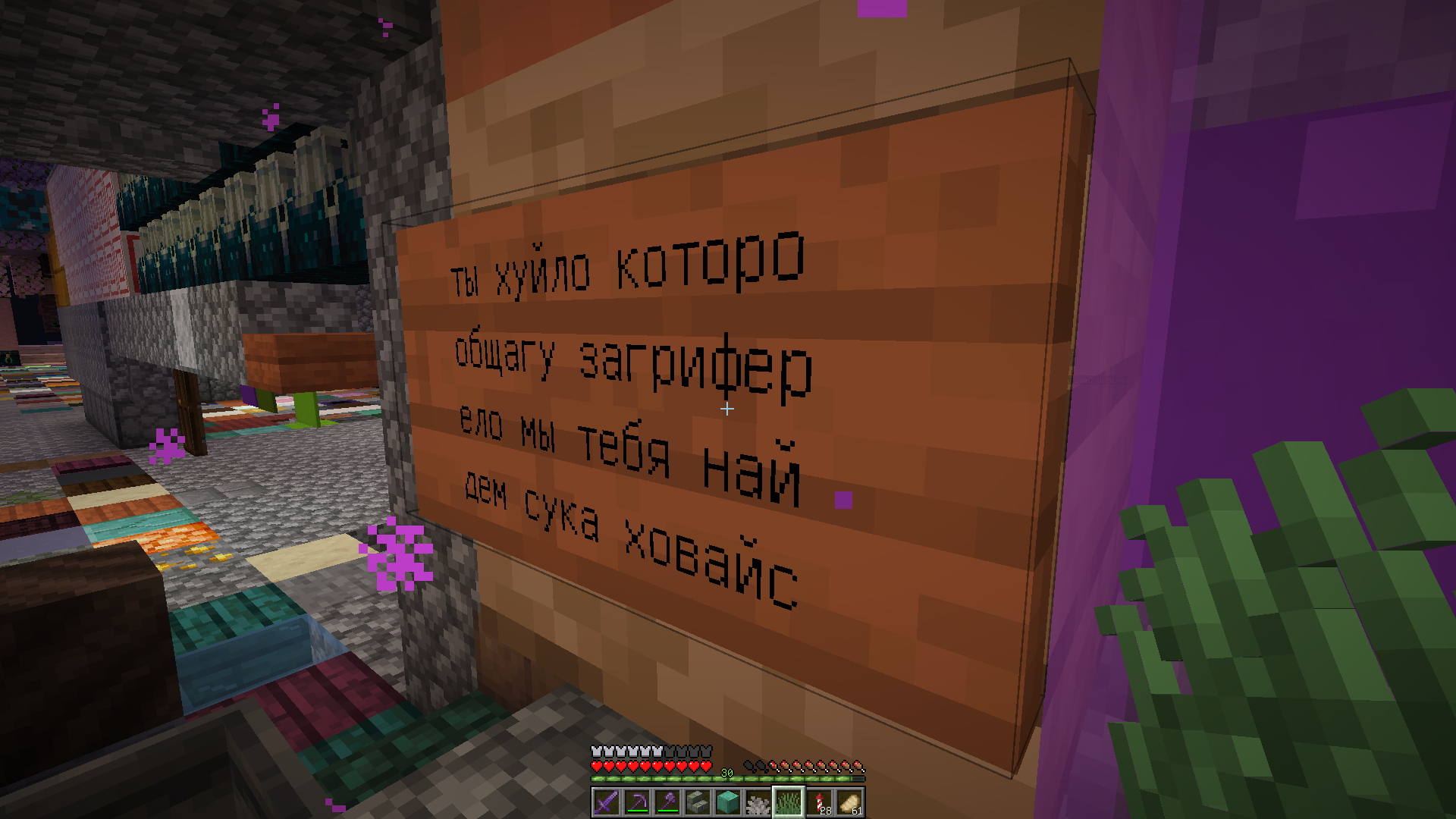 Модерация: - Я (как модератор) не занимаюсь слежкой за игроками в инвизе, не бью их со спины 32к мечом, не раскидываю повсюду кристаллы, чтобы игроки об них убивались. По банальной причине: мне лень и неинтересно этим заниматься. - Зато ежедневно захожу в игру посмотреть, чё там, как там. И баню только в путь тех, кто пришёл с единственной причиной "поднасрать". А их деятельность откатываю парой команд. - Что именно наказывается? Всё, что входит в ёмкое понятие "поднасрать". Не вижу смысла писать длинные списки запретов, всё равно гриферы, выросшие на школьных анархо-серверах, будут находить лазейки, а потом орать "вахтёропараша!". Поэтому руководствуюсь здравым смыслом. Разрушаешь без причины - бан. Нападаешь без причины - бан. - С другой стороны, налил лавакаст - не бан. И даже откатывать не буду (если только совсем криво нальёте). Пристроил к чужому дому дополнительный этаж? Тоже ненаказуемо. Перестроил чужую ферму так, что продукта стало вдвое больше? Окей. Построил что-то где-то без всякого смысла? Да ради бога. - В общем, контролируемый хаос. Как написано на сайте сервера, это место для флегматично-аутичных доброжелательных жаб. И в целом он ориентирован на строительство. - Если меня (Tengo или Ostet) нет в игре, то жалобы можно слать в дискорд. - Я тоже играю на сервере. Без админки (могу использовать её для отката грифа, но и только, просить блоки или координаты чужих баз бесполезно - не дам).