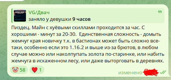 Ну серьезно, в майнкрафте нехер делать 9 часов. "Пройти" можно без напряга за час-два, не задаваясь целью. Ну там эксплорейшон на пару часов, домик еще час.