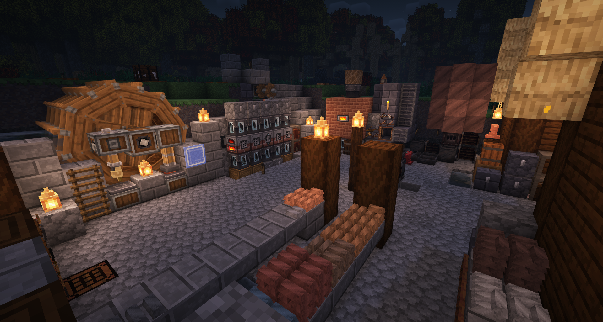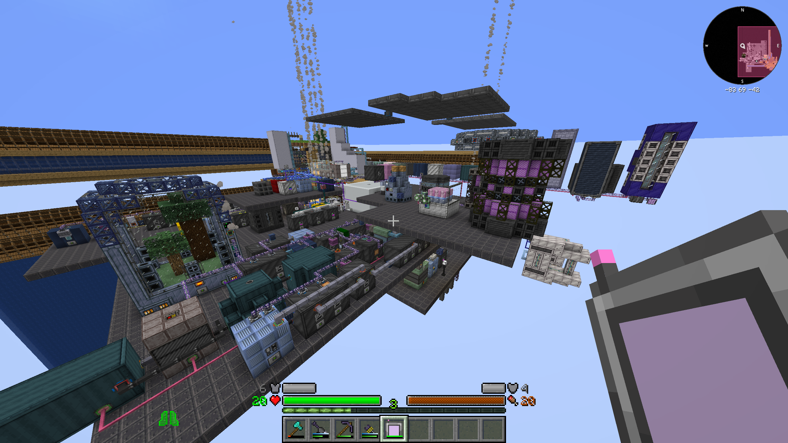 То есть допустим как выглядела стандартная добыча ресурсов в 2013 году, ставишь карьер, от него идёт поток ресурсов которые сортируются трубами, руды в дробилки и печки, ценные ресурсы сразу в сундук, кал на переработку в материю. Рядом ферма дерева из форестри которая тоже имеет аналогичные автоматизации, которая производит из дерева уголь для генераторов Если на это посмотреть со стороны то очень сильно напомнит соверемнные фермы в ваниле