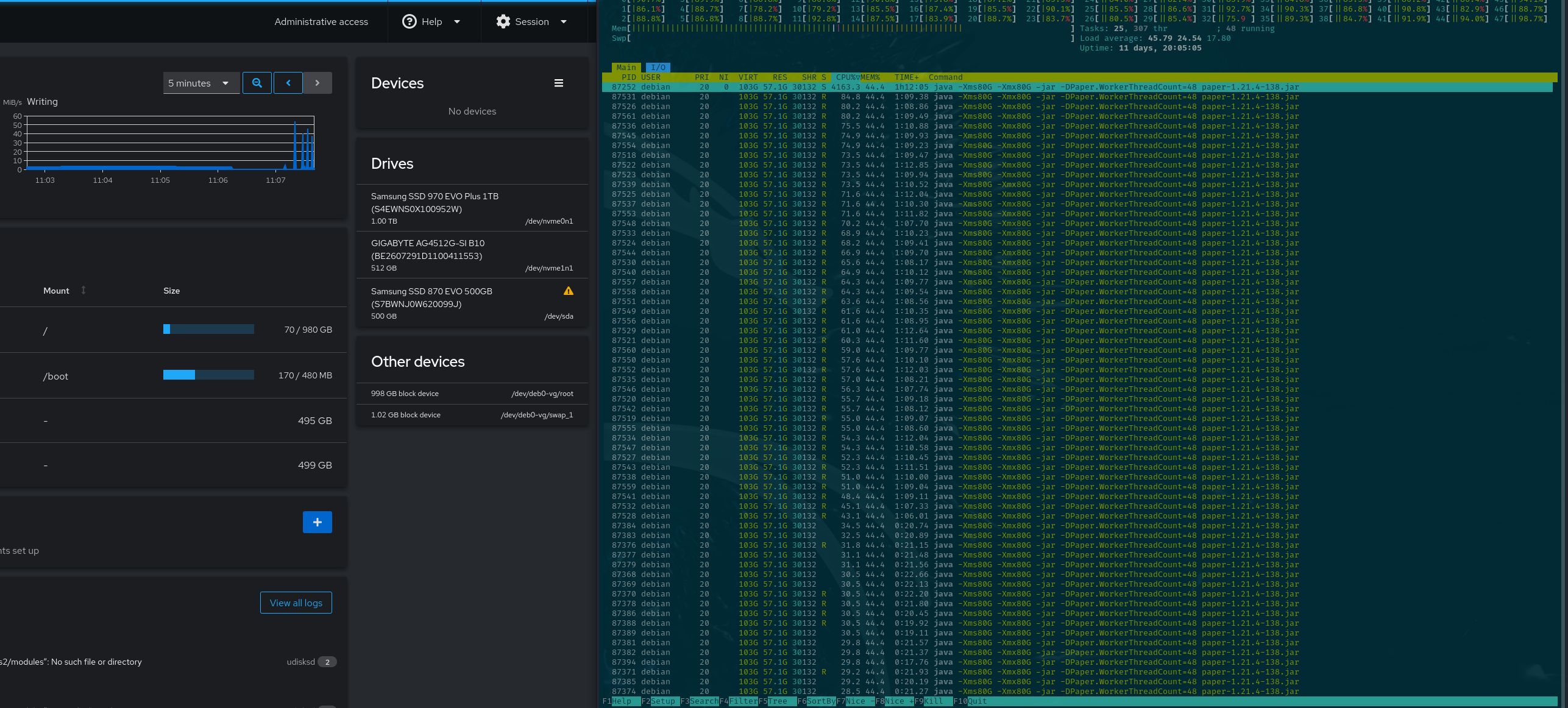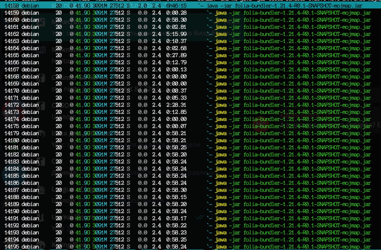 >>613225 понятно, жрет только 20 потоков из 48 возможных. остальные в основном стоят. и это ваш хваленый papermc? говна кусок такой же как и фолия. как будто на коленке делали.
