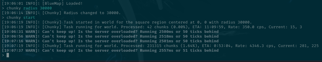 Processed: 13940487 chunks (99.08%), ETA: 0:08:43 overworld сделался, оказывается chunky radios 30000 = 30к блоков. ну ахуеть теперь. для nether и end сгенерю по 15к для тестов, если все будет ок, то придется закрывать сервер на неделю и генерить карту лол.