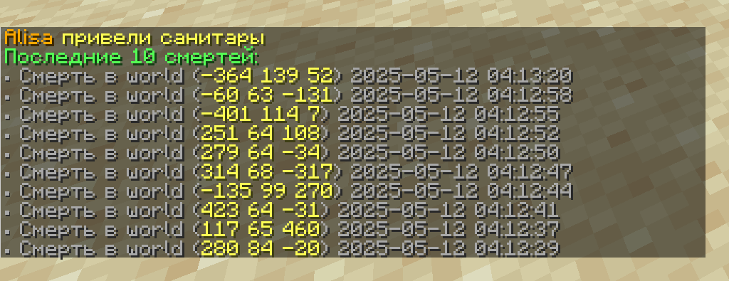 Если не успели - историю смертей с координатами можно посмотреть по команде /dh.