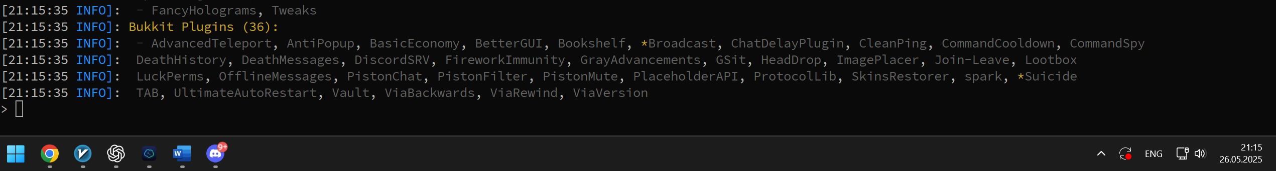 Написала плагин, который пишет координаты в личку если игрок сдох ( по команде /dh можно посмотреть последние 10 смертей с подробным лог выводом ), Пофикшен баг, из за которого фейерверки наносили урон при подключении, Для пропуска ночи теперь достаточно 30% игроков, Исправлены /msg и прочие сообщения в чате, Исправлены все пермишенсы для дефолтной группы, Реализован плагин на письма афк игрокам ( команда /mail, прочесть при входе /mailinbox ), Поправлено отображение достижений в чате игры, Настроена и протестирована антибот система, Новые игроки при первом входе получают мут на 120 секунд, ( это связано с медленными атаками ботов, которые подключаясь через какое то время начинают спамить в чат пакетами ) Написан с нуля плагин на кастомные картины, аналог imagemaps, подробнее здесь: #свои-картины ( https://discord.gg/yRs2qGPAu7 ) , Прочие мелкие правки, ( которых, к слову, очень много. начиная от интеграции дискорда и заканчивая менюшкой на /menu, кулдауна для команд, сообщениями о смертях, табом и т.д )