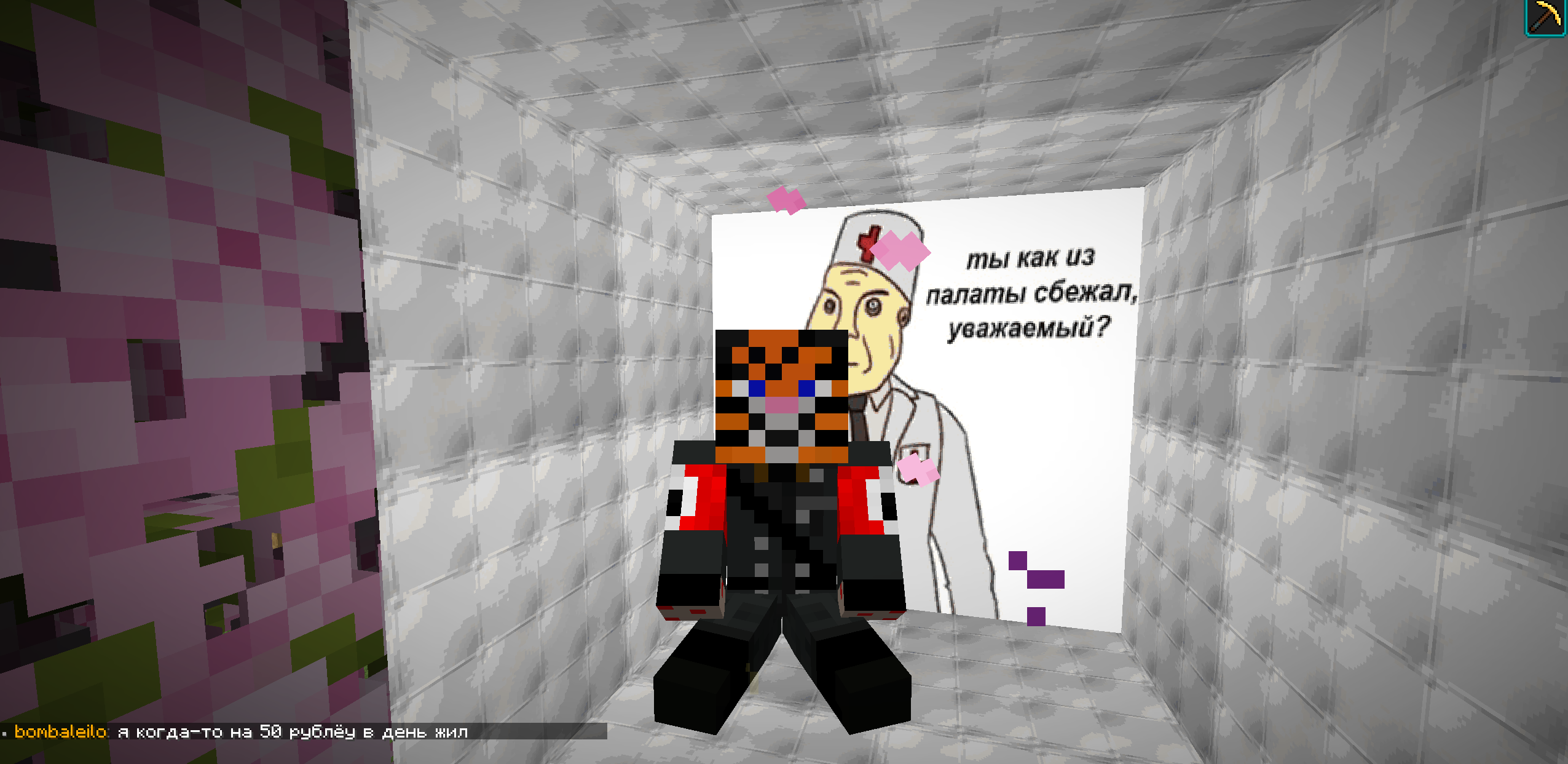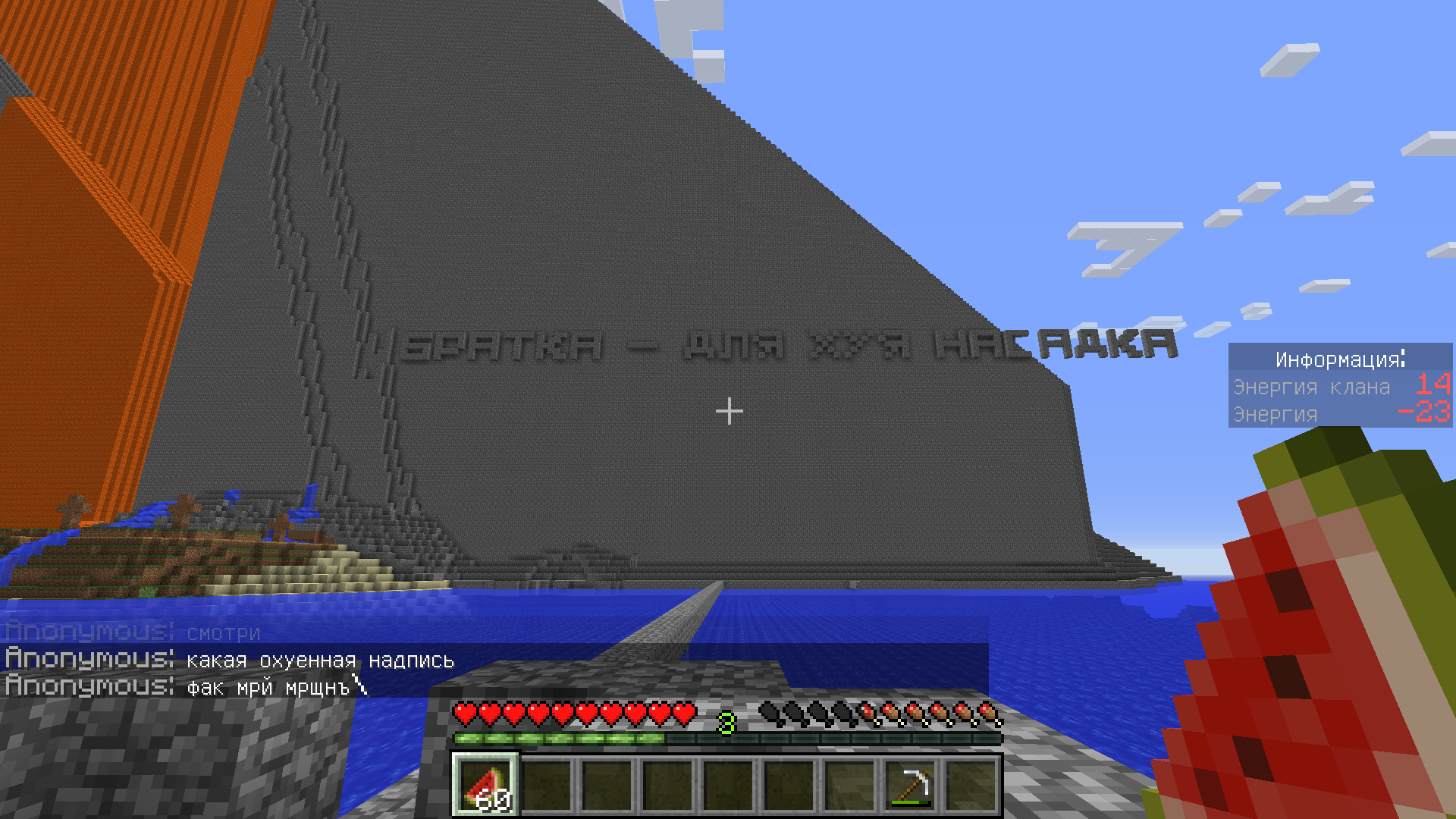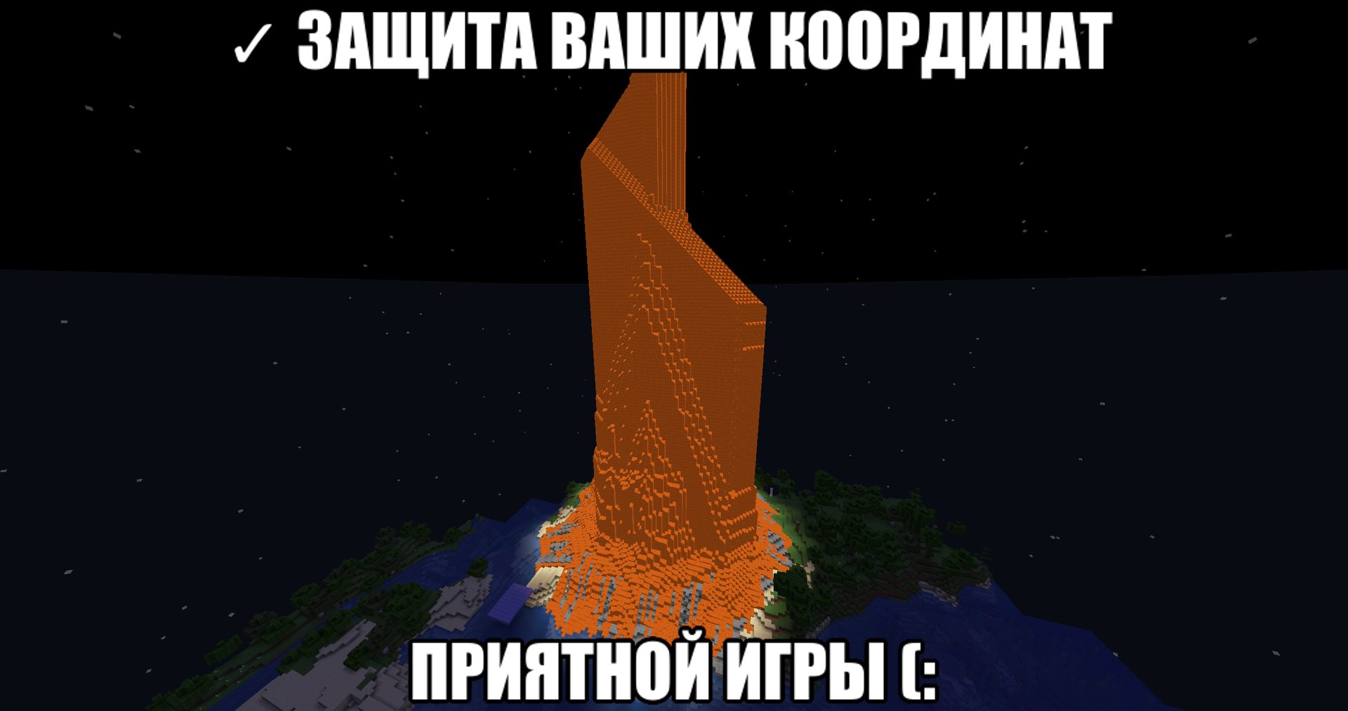 >>614723 Сервер негативно настроен по отношению к новым игрокам, там в основном старые друзья собрались, как я понимаю. Посреди спавна огромная елда достигающая почти верхней границы мира, вокруг неё абсолютное ничего. Смысла нет заходить туда.