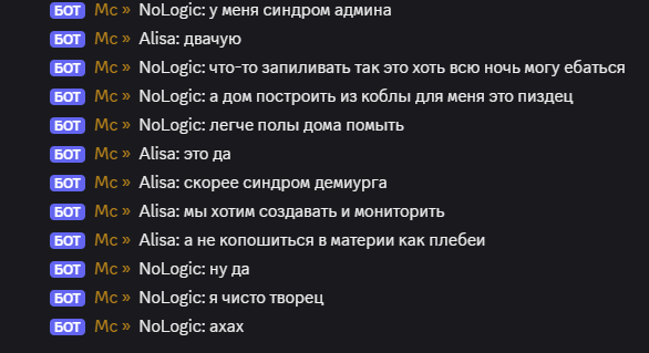 Я добавила мини обнову, теперь когда Вы пишите всё что угодно что имеет слово " Шизиса " в дс или в майне, это отправляется локально развёрнутой мной нейросетке без цензуры.