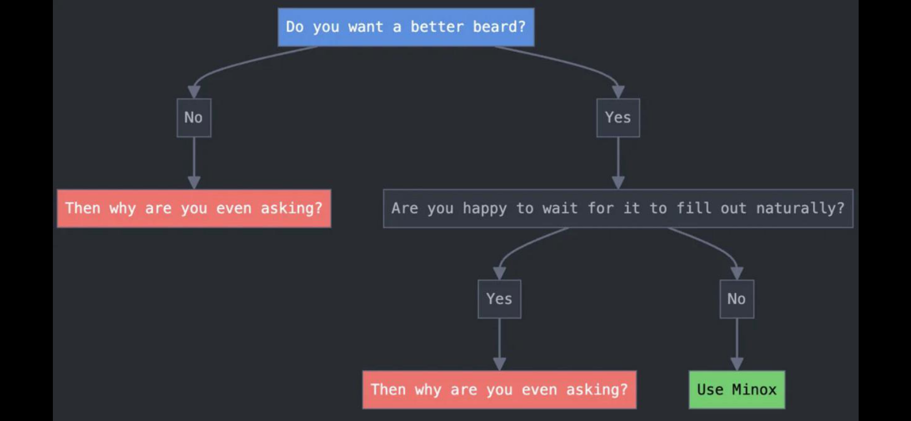 ДОЗИРОВКА: в отличии от облысения, при выращивании бороды с миноксом чаще всего можно обойтись дозировкой 1 раз в день по 0,5-1мл (4-8 пшиков) на всю зону бороды, поскольку лицевая растительность не подвержена выпадению, и вышеуказанной дозы вполне достаточно для стимулирования волосяных фолликул. При такой дозировке побочные эффекты будут менее заметны или отсутствовать вовсе. Также, одного флакона миноксидила будет хватать на 2 месяца полноценного обмаза, что является бесспорной экономией ваших средств. Можешь мазать два раза в день, с разницей в 8-12 часов. Но это не гарантирует улучшения эффекта, более того, может вызвать побочные эффекты. Миноксидил жестко привязан к возрасту! Не смотрите на единичные успешные случаи, когда 17-летний школьник из ничего получил шикарную густую щетину. Миноксидил - это подпитка, которая помогает прорасти тому кол-ву волос, которое должно расти в данный возрастной период, но по каким-либо причинам не росло!