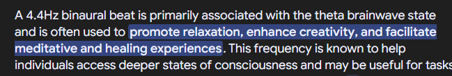 >>679516 И вообще это неких читкод современности, который позволяет годы практики медитации скипать, так как бинауралки тебя за минут 15 вводят в нужные состояния меняя частоты роботы мозга до нyжных без серьезного опыта медитации.