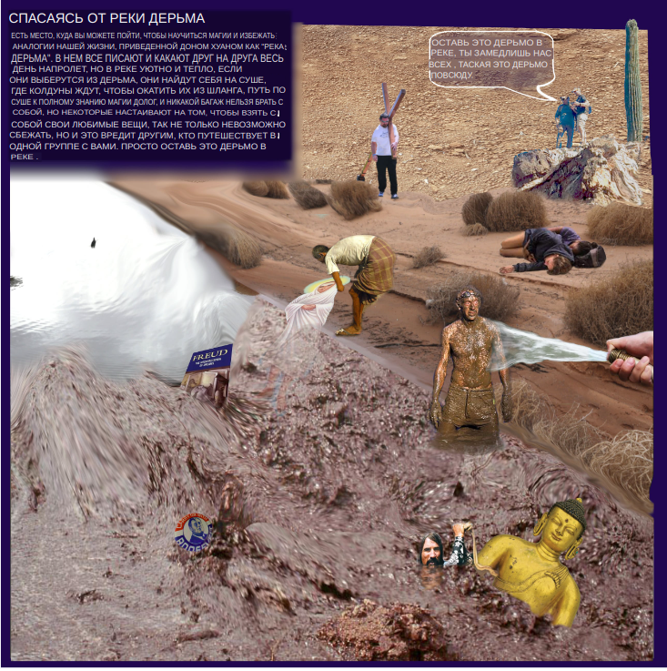 Как сказал Дон Хуан, человечество живет в реке дерьма, постоянно мочась друг на друга и разбрасывая дерьмо, когда сильно злится. Мы все по плечи в ней. Время от времени кто-то действительно опускается ниже поверхности реки, глубоко в грязь, и вы видите лишь несколько пузырьков, всплывающих время от времени. Плохие люди, такие как духовные и религиозные лидеры, взбираются на плечи других, думая, что они достигли какой-то высшей цели. Но на самом деле они просто паразиты. Они предназначены для того, чтобы оглуплять остальных настолько, чтобы те верили, будто смогут выбраться из реки дерьма, оставаясь в ней. Тем временем за пределами реки дерьма, на суше, поджидают маги. Если кто-то выберется наружу, они обливают его из шланга. Но как только люди, выбравшиеся из реки дерьма, осматривают сушу и понимают, что она прекрасна и удивительна, они также замечают, что там холодновато. Там нет всех ваших друзей, семьи и привычного окружения. Поэтому большинство прыгает обратно в реку. Им "уютно" в реке дерьма. Такие больше никогда не пробуют выбраться снова. Они навсегда пополняют ряды мелких тиранов в этой реке.