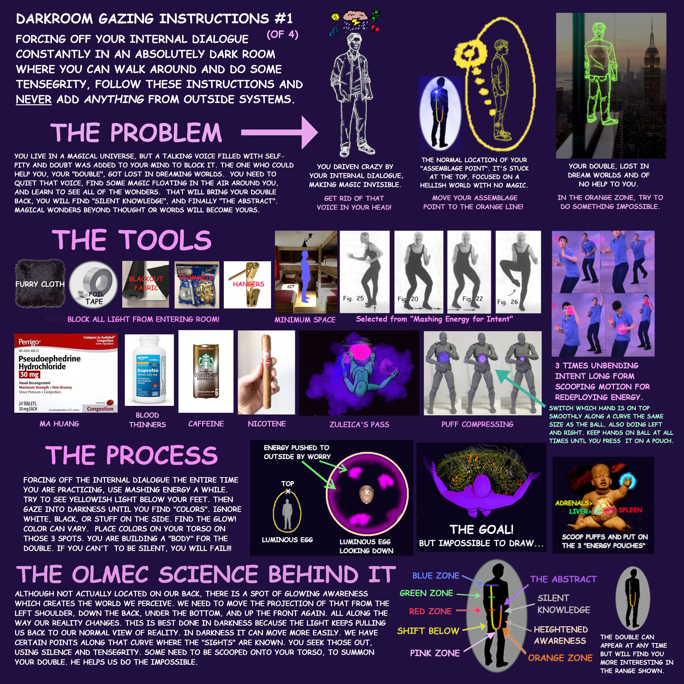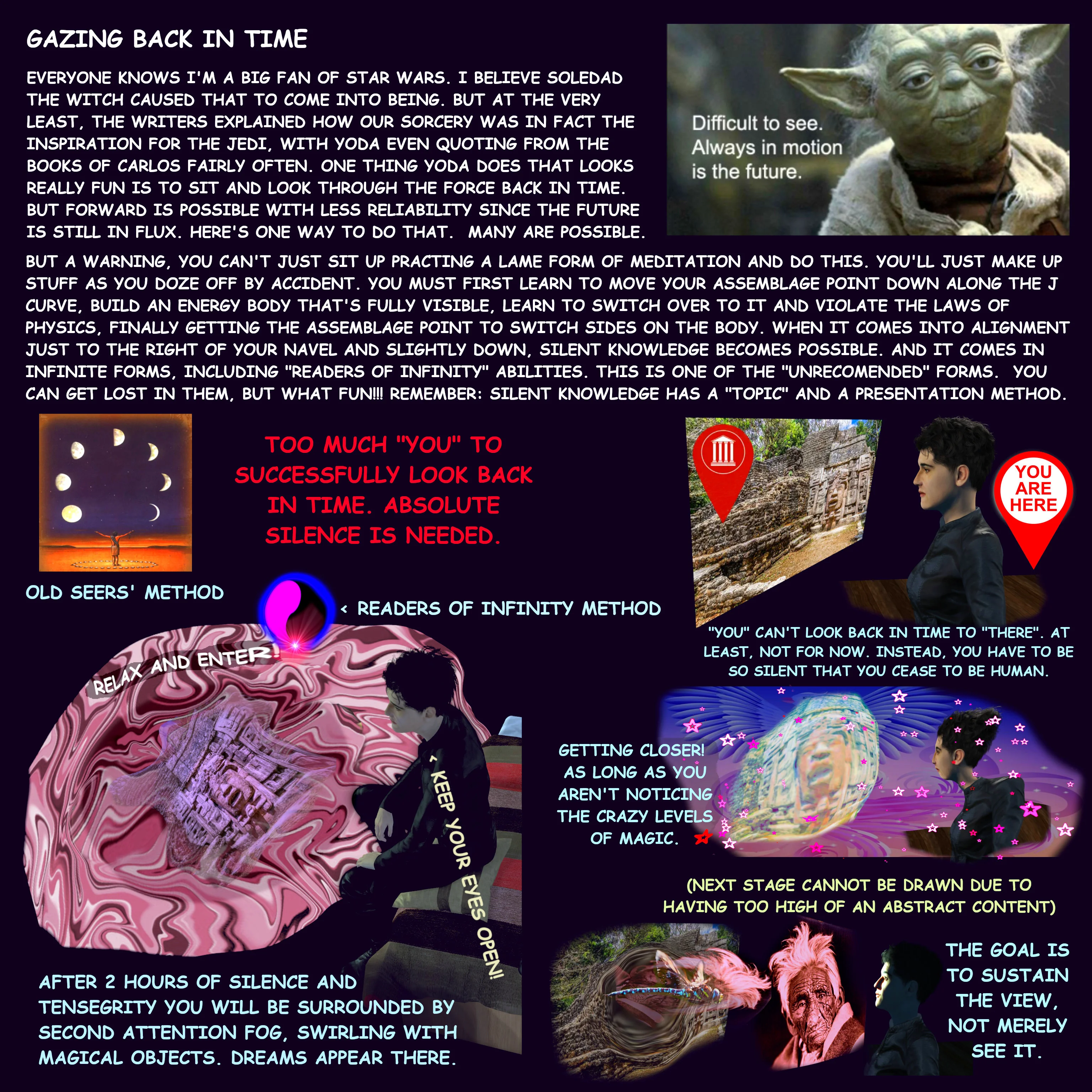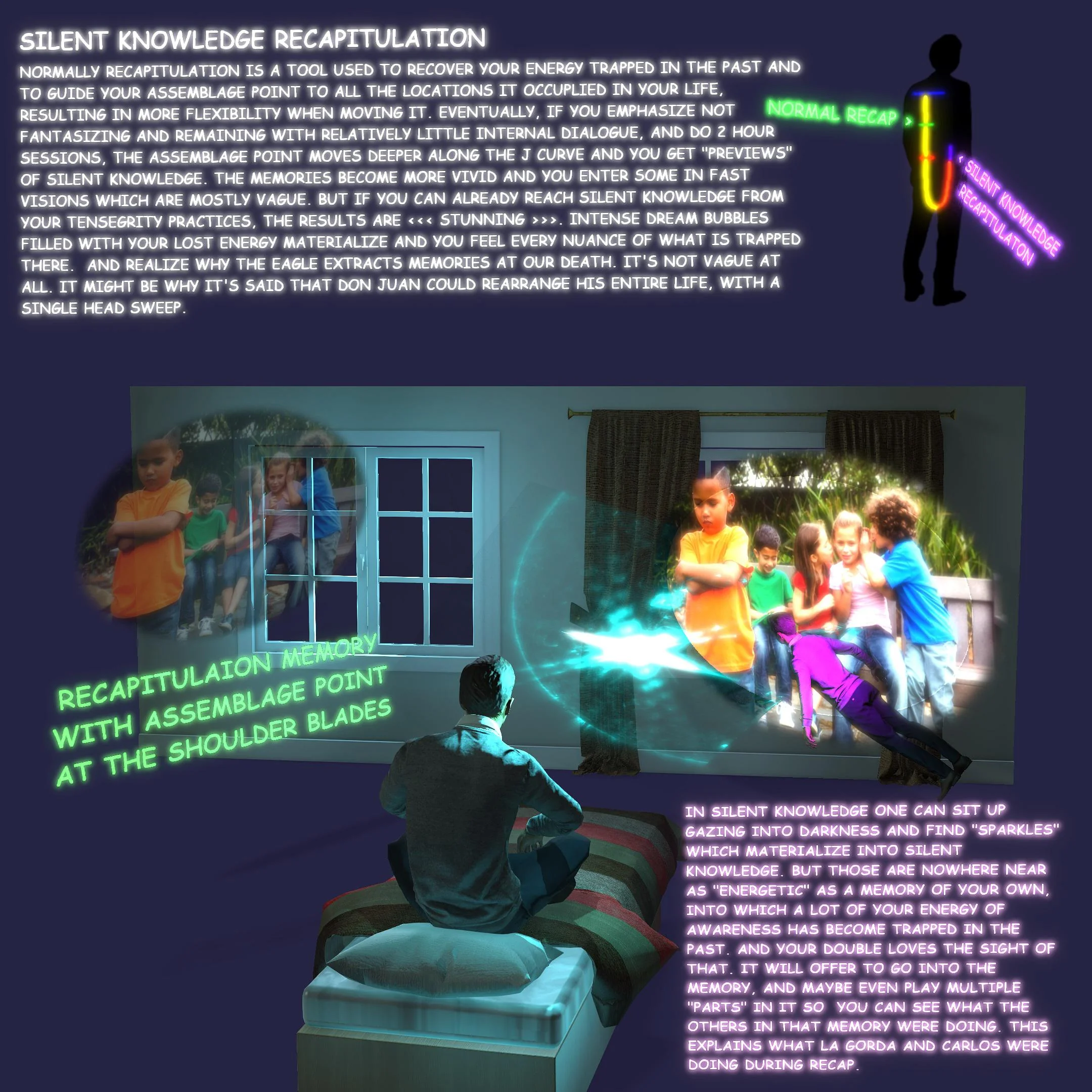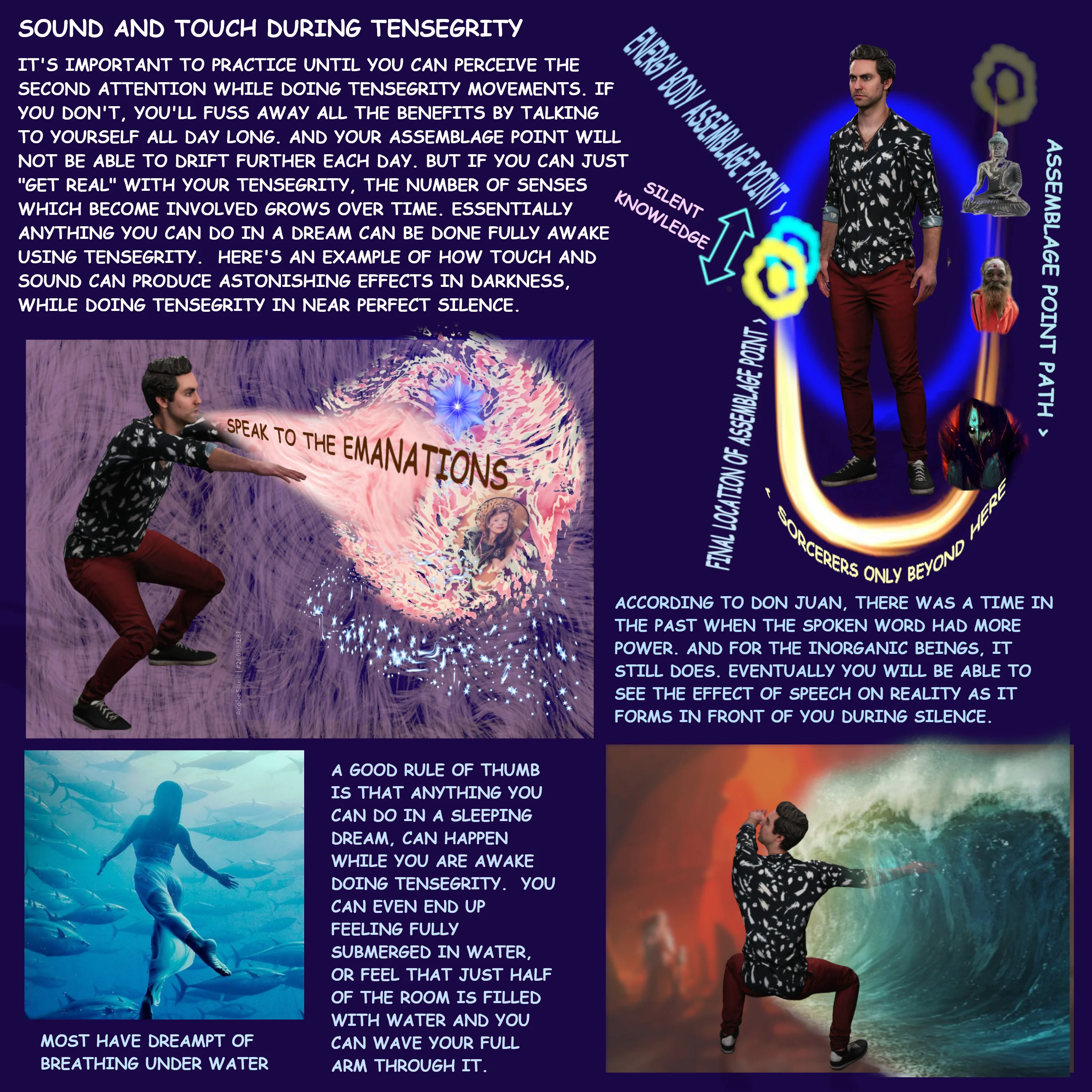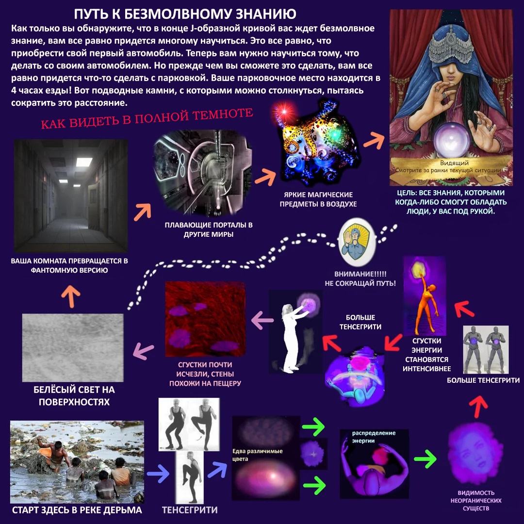 >>666413 (OP) Мне кажется что вы слишком преувеличиваете роль тенсегрити форся эти пикчи. Тот факт что их делали приближенные Кастанеды по семинарам не делает их правильными и истинными. В конце концов нам просто дано направление, объяснение как и с чем работать, а дальше каждый сам по себе идет. А на этих пикчах прям как во всех других религиях тебе уже сразу пояснили что тебя ждет, этапы пути и все такое.