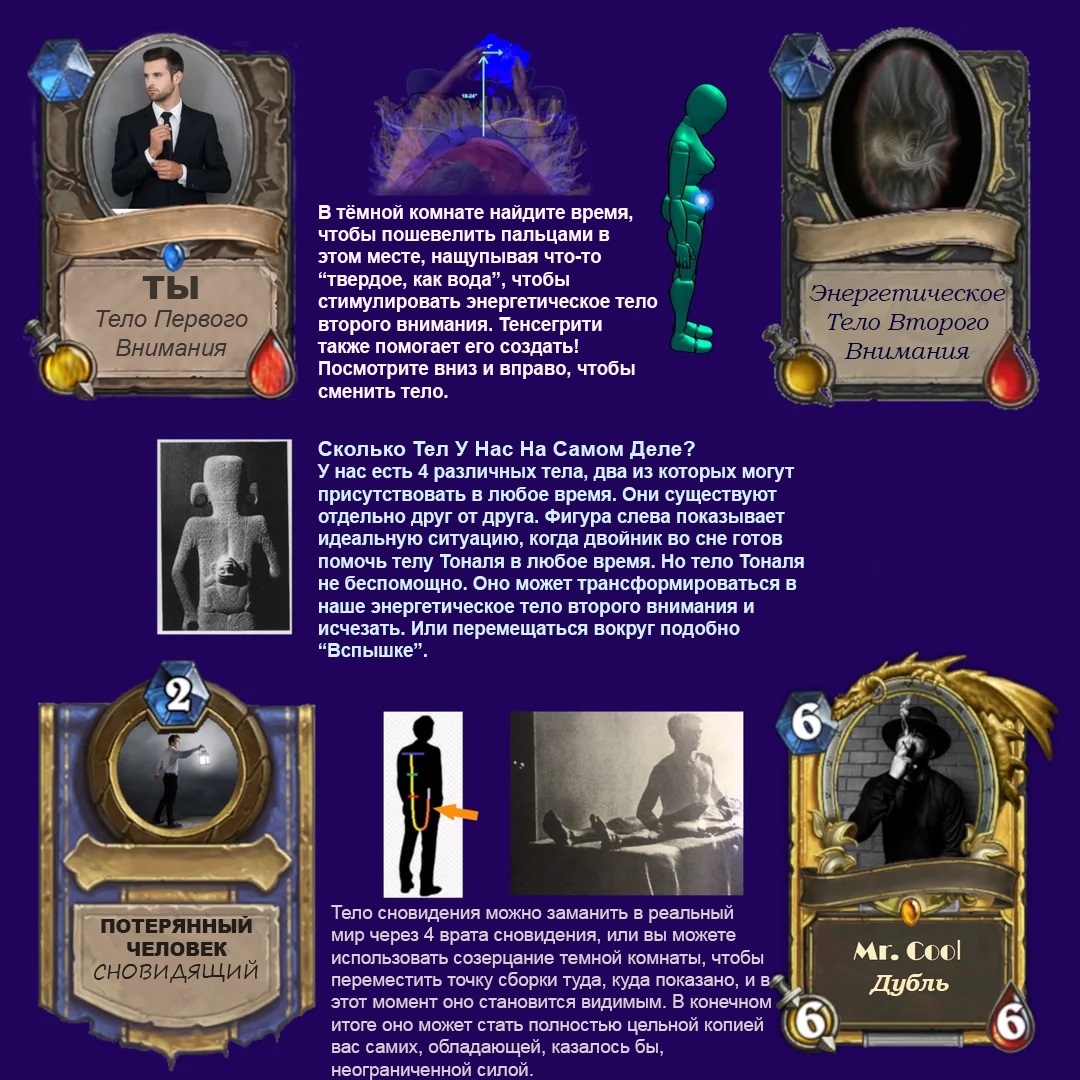 Выдержка оттуда: https://youtu.be/Td1qx8-bLTw?t=1190 на 19:48 >Pouring Intent Into Two Pouches Of The Body - Pass #2 >Изливание намерения в два мешочка тела - Пасс 2 >Видящие древней Мексики считали, что у человека есть три энергетических мешочка (energetic pouches). Один находится над печенью и желчным пузырем, другой — над поджелудочной железой и селезенкой, а третий — над почками и надпочечниками. Эти три мешочка служат резервуарами энергии. Мешок справа, над печенью, они считают центром быстрого, немедленного действия. Мешок слева, над поджелудочной железой, считался центром чувств, а третий, над почками и надпочечниками, считался центром устойчивого и целенаправленного действия. После призыва намерения следующим логическим шагом, по мнению провидцев древности, было заполнение двух лобных мешочков человеческого тела как конгломерата энергетических полей. Отсюда и название второго магического пасса — «Вливание намерения в два мешочка тела». Они считали, что намерение должно предшествовать всему, что мы делаем. Чтобы выйти из нашего филума, мы должны сначала установить намерение сделать это, направив намерение в два мешочка для чувств и немедленного действия.