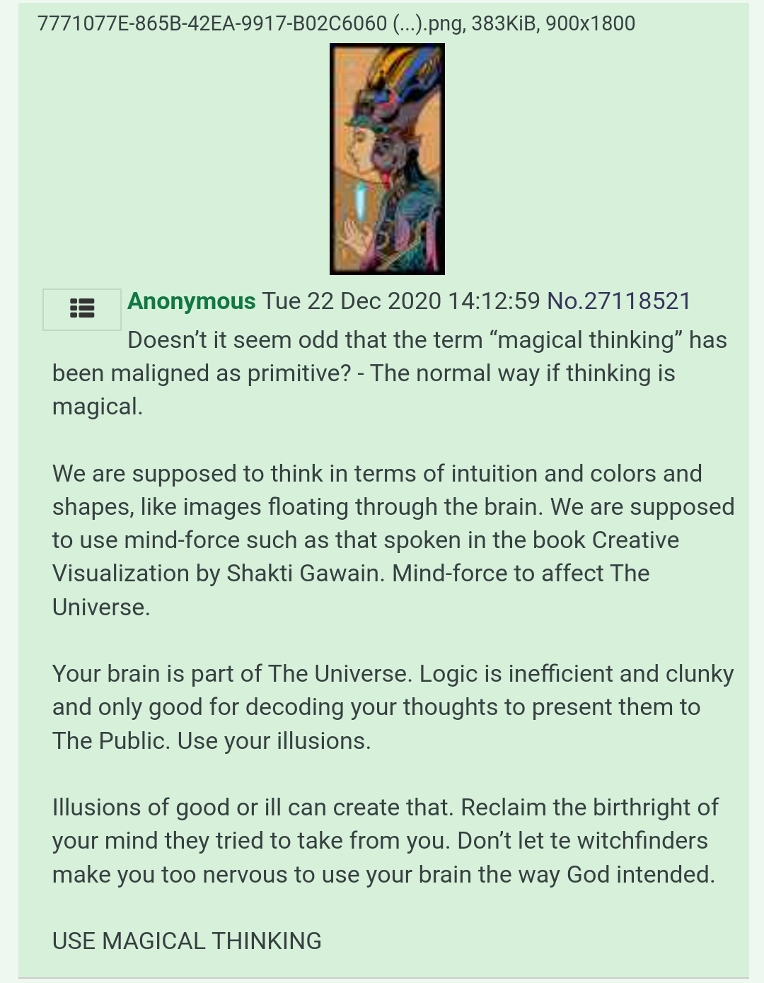 >>666551 Если ты всем этим занят, вкладываешь усилия, намерение само освобождает тебя. Не фантазия, именно так и происходит, намерение подыгрывает тем кто всерьез встал на путь магии, ты оказываешься втянут в намерение магов, втянут в другой сюжет. Жизнь лишь игра, управляемая намерением, внешней силой. Поэтому жизнь мага складывается оптимальным для дальнейших практик образом, чтобы и время и место были. Например тебя эвакуирует случайность еще до войны, чтобы ты мог продолжать практики. Или что-то вытащит во время самой войны. Если же ты попал на войну и тебя там убили, то ты не особо стремился в магию, у тебя была другая внутренняя мотивация, сознание слишком завязано на сюжет обычных людей, не свободно. Намерение тебе не подыграло, это была твоя судьба. Все, что ты можешь это безупречно выполнять действия в доставшемся тебе сюжете. Власти у тебя никакой все равно нет. Пока можешь практиковать нагвализм - практикуй безупречно, вкладывай усилия в те же тенсегрити и остановки ВД. Намерение реагирует на такие вещи.