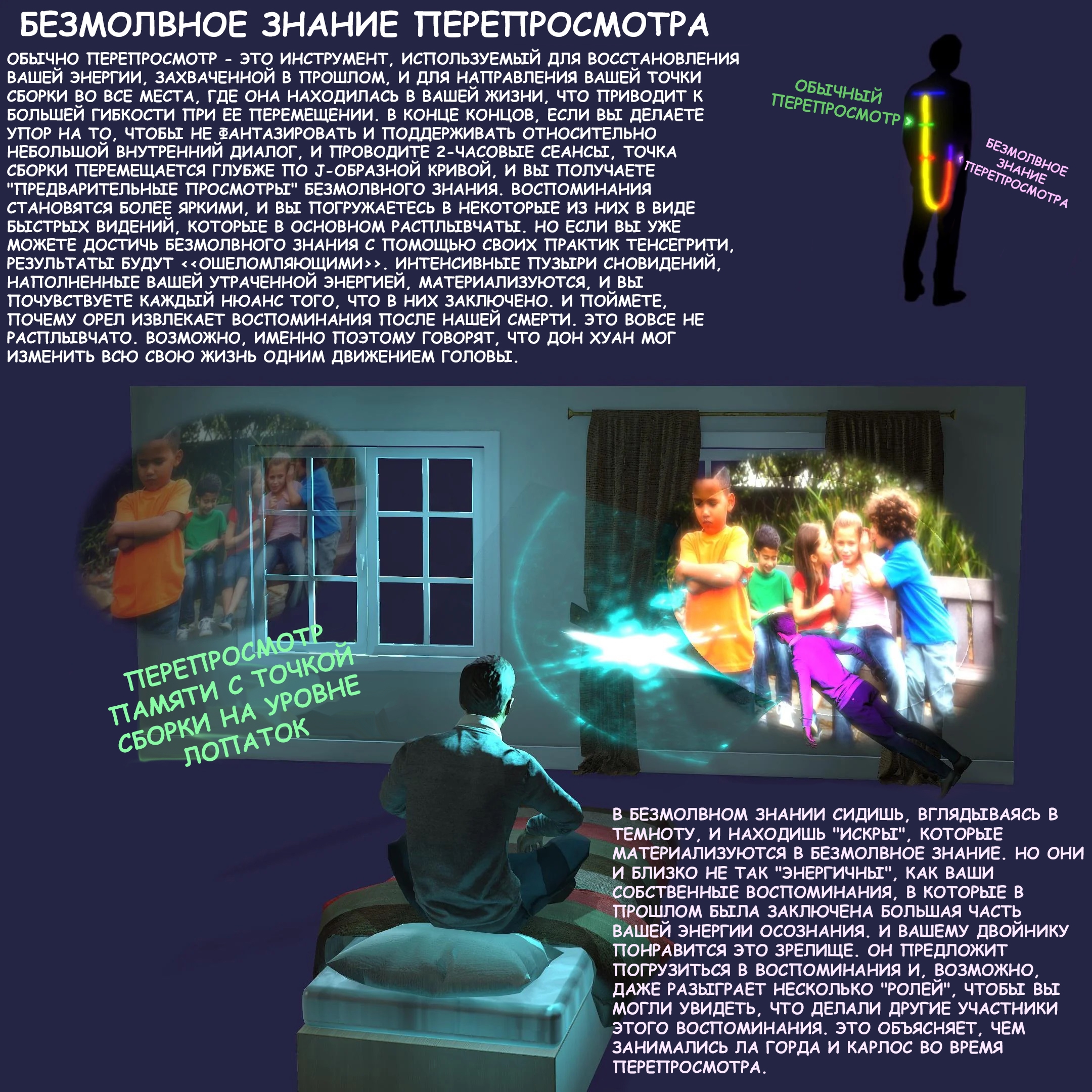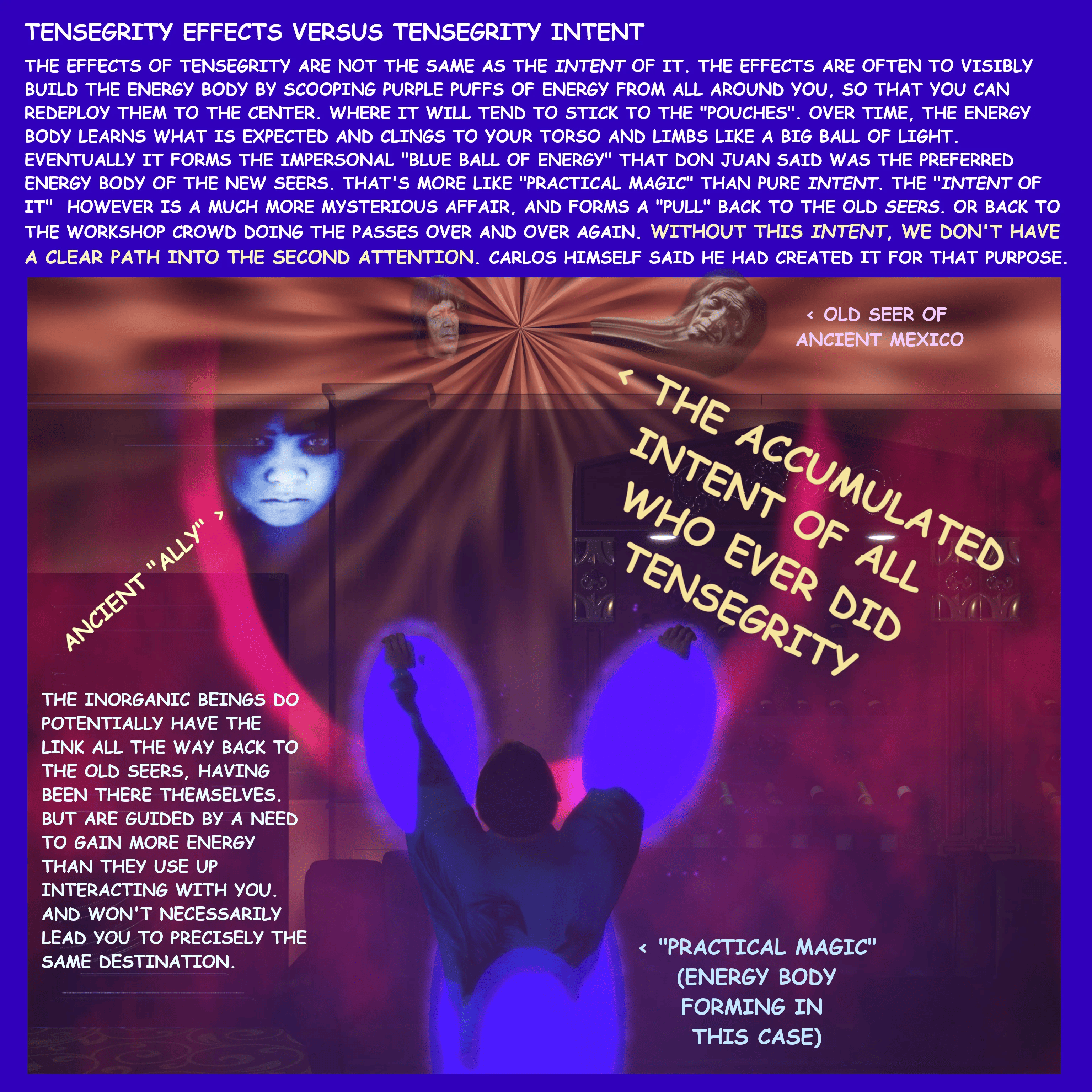>>666873 Книга по тенсегрити, 4 DVD в ютубе - конкретные туториалы. Но там только тенса, штуки вроде перепросмотра, остановки ВД, созерцаний и даркрума раскиданы по книгам с описаниями его обучения у Дона Хуана и ведьм. Их надо оттуда "вычленять" и практиковать. Тенсегрити в отрыве от всего не ведет к хорошим результатам, нужно как минимум дополнять внутренней тишиной, на развитие которой уходят годы. Если конкретно практика интересует, то вот топ необходимых практик с семинаров: