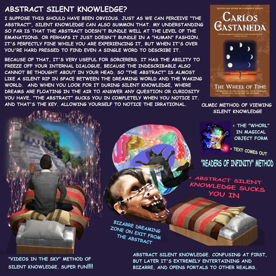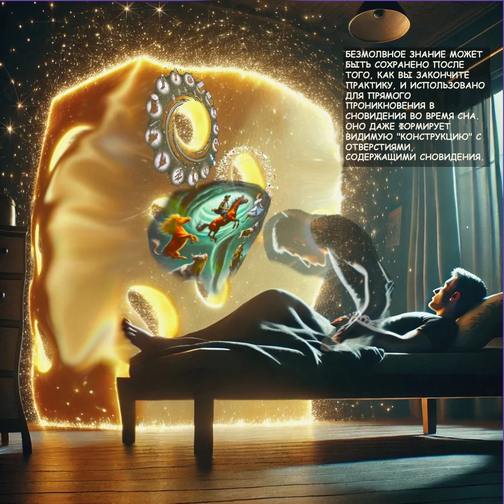 Это для обычного восприятия. По идее, надо в бодрствующем состоянии настраиваться на древние культы через формальное изучение культуры, а в сновидение или даркруме может появиться внезапный гость, в идеале сущность безмолвного знания, которая может надиктовать откровение о скрытом воздействии ритуалов, свойствах растений или что-нибудь совершенно неожиданное... Это очень продвинутый уровень. Мне даже неловко его описывать - у меня очень слабые результаты, только рожицы, фигуры, абстракции, изредка они говорят отдельные фразы, не всегда цензурные. Да и происходит это всего несколько раз за месяц. Такое у всех людей бывает, просто они внимания не обращают.