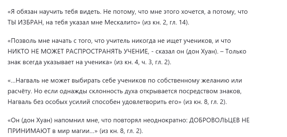 Тоже не очень понятно. Отдаёт религией с её застывшими ритуалами ради ритуалов. Дон Хуан, как мог, сдвигал точку сборку Карлосу, выбивая из привычного восприятия, пока не сформировалось намерение и нужда в бездумной ритуалистике не отпала.