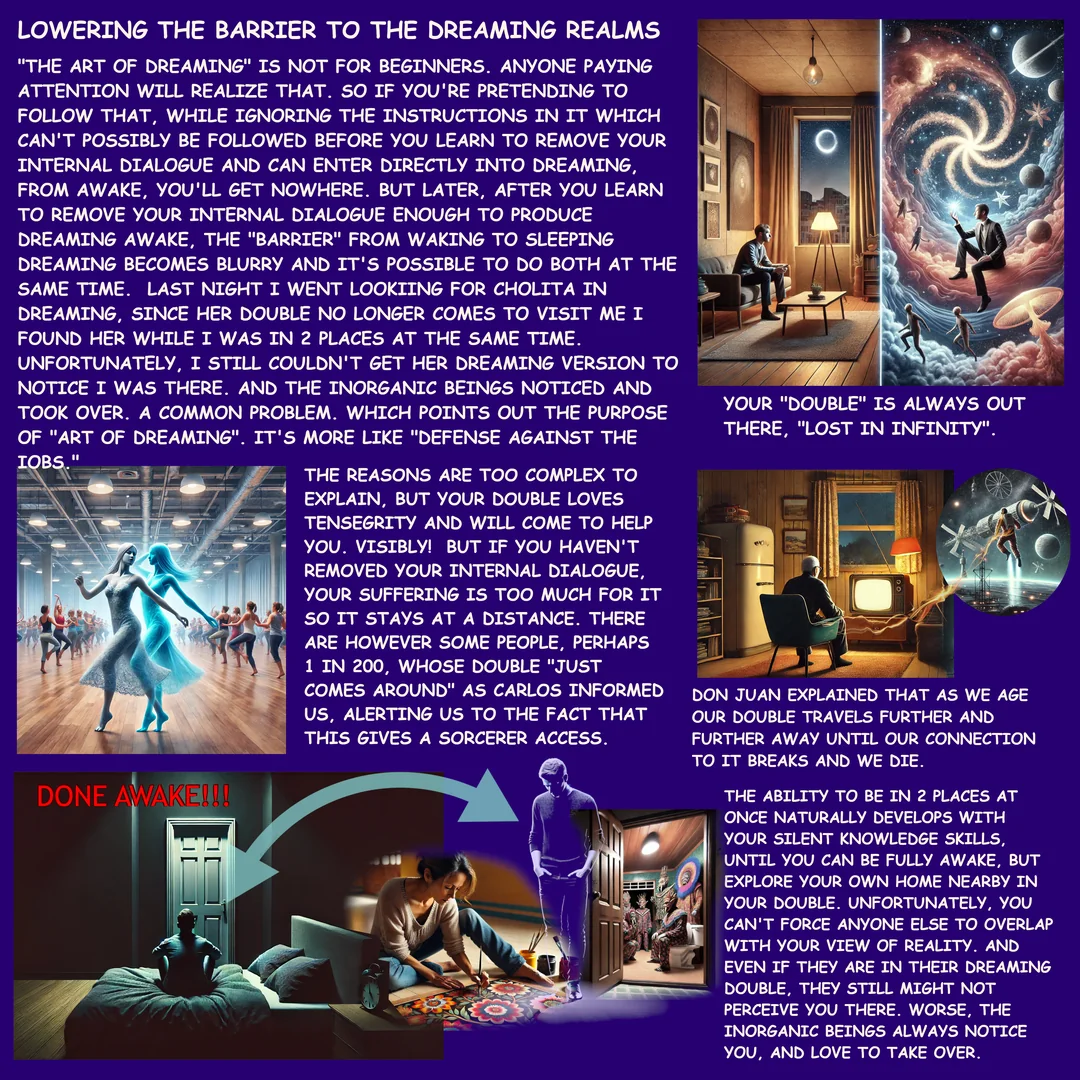 Но главнее у Кастанеды всё же не галюны, а сновидение. Про них я написал в контексте остановки ВД, есть мем "в любой непонятной ситуации останавливай внутренний диалог" и я познал его смысл