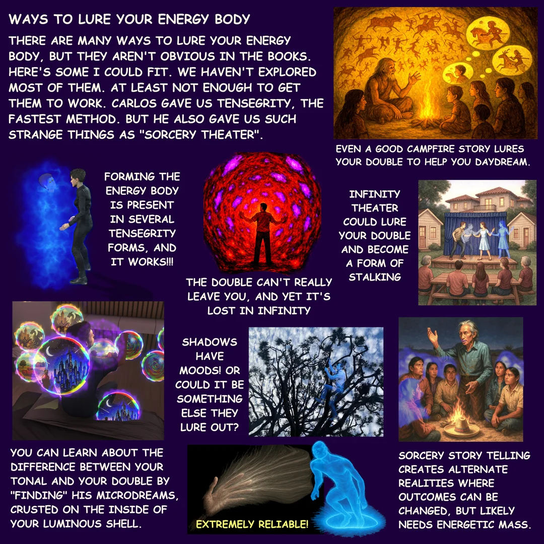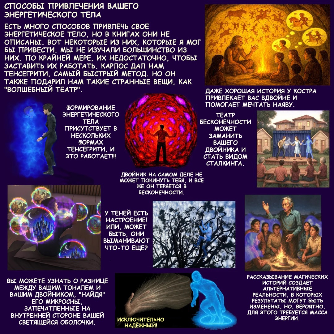 >>668402 Да, тональ это отдельное тело, со своим характерным свечением. Его можно выманивать "наружу", так же как дубль приманивать сюда. Но это не тела из фантазий астральщиков, которые сидят запертые в клетку, пока их оттуда не выпустят как джина из бутылки, чтобы они потом полетели как воздушные шарики. Тональ - это сама клетка и есть, фиксированные энергетические структуры. Но их можно достаточно расфиксировать, чтобы тональ мог на какое-то время трансформироваться и даже на небольшие трюки в стиле дубля. Но как дубль он не станет, у него слишком мощные привязки. Зато у него есть другие бонусы.
