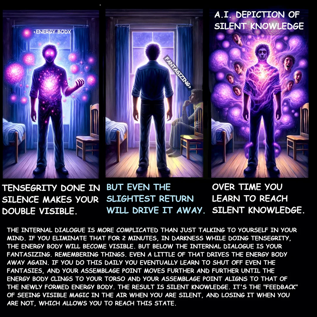 >как эти проработки действуют? Действуют ровно так же как в книгах. Нужно практиковать тишину месяцами-годами, пока это не станет командой Орла. Потом подключается намерение, сдвигающее точку сборки в другое положение. В новом положении большинство факторов, действующих в нашем стандартном, перестают действовать. Это положение не стабильно, то есть как в сказках буддистов о просветлениях не будет, раз и включилось навсегда, такого не бывает. Если бросаешь форсить тишину, все постепенно возвращается в норму. Но новое положение более-менее стабильно, если тишина разработана и практикуется. То есть например ты форсил тишину последние месяцы регулярно и равномерно, пока она не включилась. Если после этого будешь продолжать, регулярно, без длительных перерывов, то в следующих попытках она будет достаточно легко достигаема и более-менее стабильна. Уже не будет такого сопротивления тоналя и не будет тенденции к залипанию в стандартном человеческом состоянии, переход во внутреннюю тишину будет даваться значительно легче и быстрее. Больше того, тебя начнет постепенно тянуть в это состояние. То есть это уже не как выше описали сильнейшее утомление и голод до слов, такое бывает от непроработанной тишины. При проработанной наоборот складывается тенденция, что тебя больше тянет назад в это состояние, потому что оно ощущается как естественное, в котором более комфортно быть и восстанавливающее энергию.