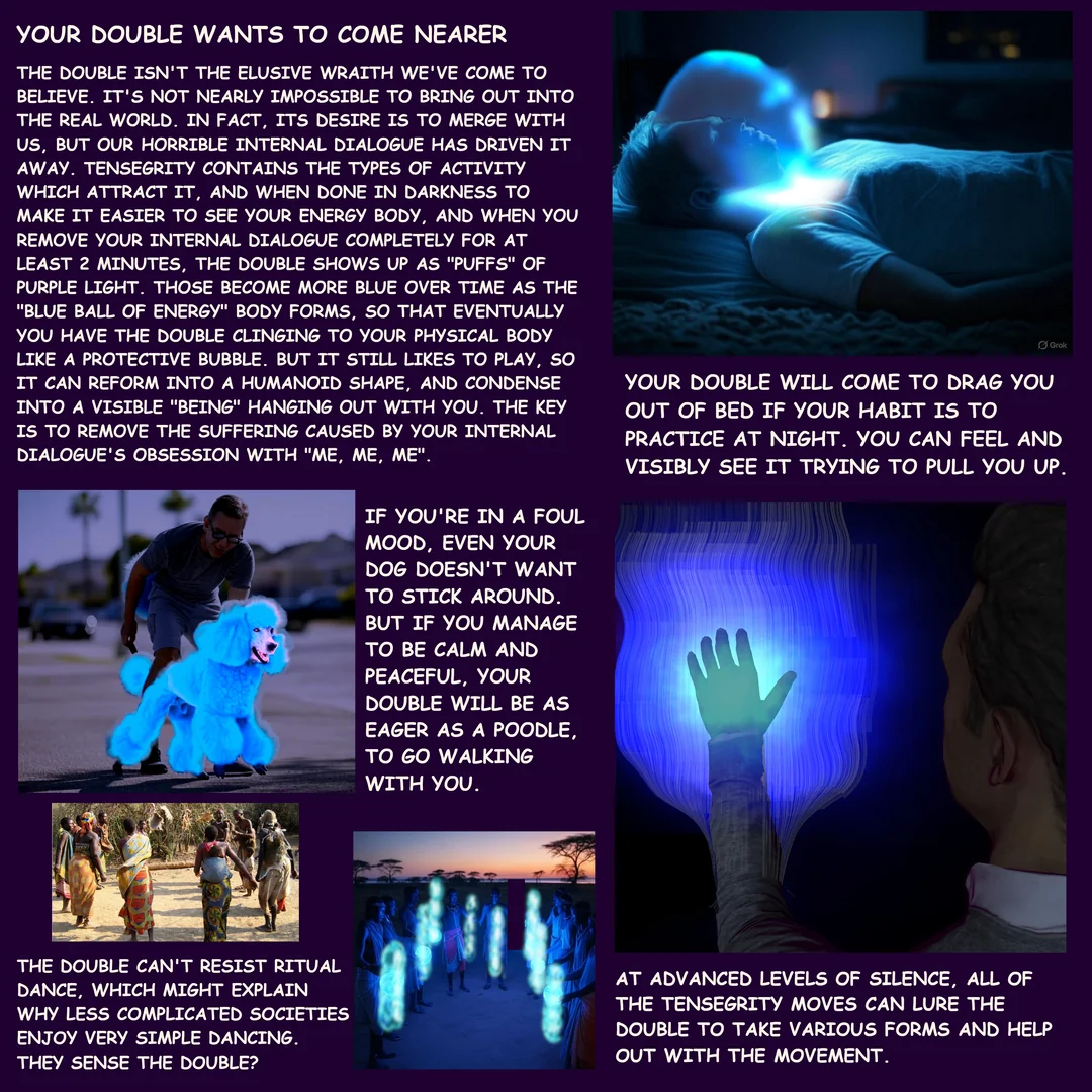 Такая мысль возникла, что дубль может играться нашими аватарами в видеоиграх. Почему люди так ими загипнотизированы? Могут проводить там по полдня. А предыдущие поколение было загипнотизировано телеком. Человек без аутизма может быть прикован к экрану часами, не ожидая никакой награды (речь не о шоу, которые обсуждают со всеми и не об онлайн-играх, где обезьянье поведение может быть ещё тупее, чем в жизни, хотя и в онлайн-играх могут происходить маловероятные события и странноватые знакомства с людьми, которые могут потом повлиять на всю жизнь). Пожалуй, книги и прослушивание музыки в одиночестве тоже близкая тема. Речь именно о системе «человек и виртуальный мир». Да и после особенно долгих сеансов задротства возникает такое плавающее полутрансовое состояние иногда и с глюками.