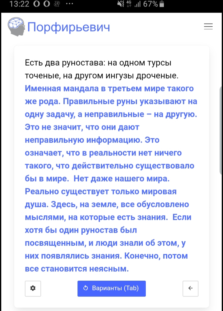 Есть два руностава: на одном турсы точеные, на другом ингузы дроченые. Именная мандала в третьем мире такого же рода. Правильные руны указывают на одну задачу, а неправильные – на другую. Это не значит, что они дают неправильную информацию. Это означает, что в реальности нет ничего такого, что действительно существовало бы в мире. Нет даже нашего мира. Реально существует только мировая душа. Здесь, на земле, все обусловлено мыслями, на которые есть знания. Если хотя бы один руностав был посвященным, и люди знали об этом, у них появлялись знания. Конечно, потом все становится неясным.