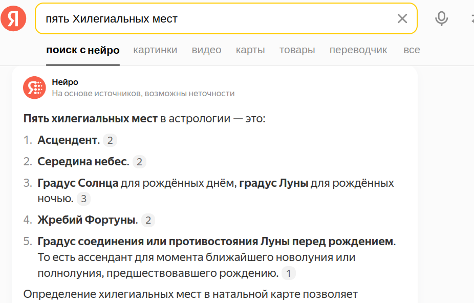 >>672105 >хилегиальные места — это 1, 11, 10, 9 и 7 дома Не всегда. Некоторые хелегиальными местами называют кандидатов на роль хилега. То есть Солнце/луна, сигизия, гороскоп (АСЦ, куспид первого дома), парс фортуны.