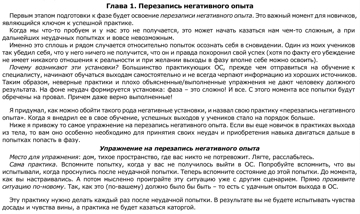 2) Фаза это пространство психологической инерции. Оно по дефолту строится на основе ожиданий и имеющегося опыта. Даже то, что вы оказываетесь в фазе в горизонтальном положении в совей кровати в соей комнате, а не где-нибудь (что вполне можно) - исключительно результат ожиданий.
