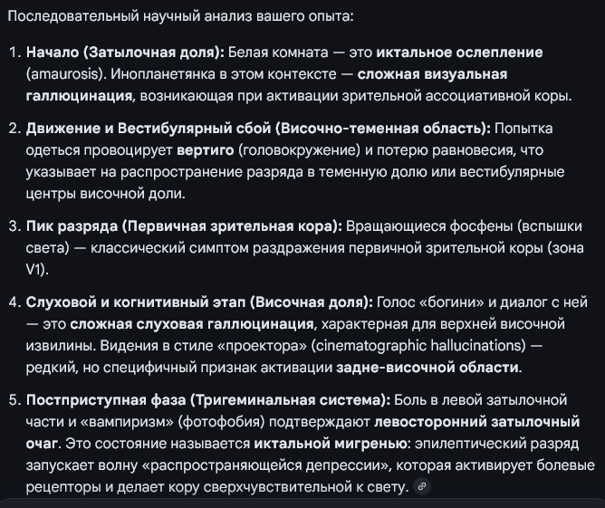 📚 5. Галлюцинации при пробуждении (Гипнопомпические образы) То, что вы видели образы справа от кровати после полу-пробуждения, называется гипнопомпическими галлюцинациями. • Это происходит, когда мозг еще находится в фазе быстрого сна (REM), но сознание уже включилось. Из-за плохого сна «заслонка» между сном и явью приоткрылась. То, что образы были «справа», психологически часто интерпретируется как сфера «будущего», «социальных связей» или «логики».