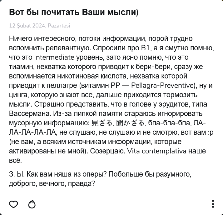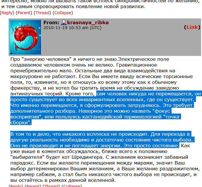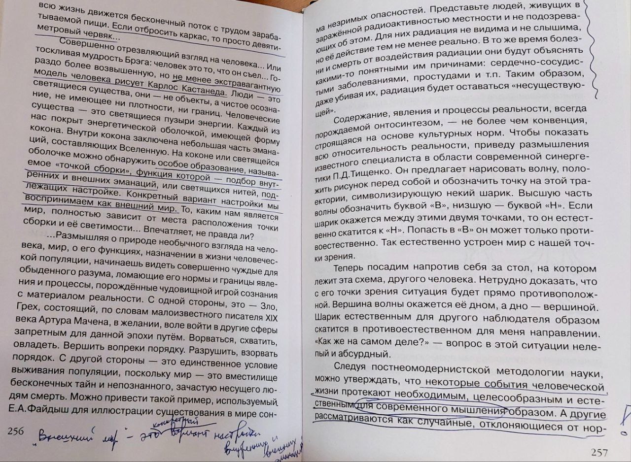 >2 абзац Примерно так и представлял, что будет воспринят образ описанного. Только в моём, и думаю не только, случае все диаметрально противоположно. Это ты хорошо описал образ, к которому стремятся многие аноны из треда, с пеной у рта уверенные, что это их желания, попутно защищая эту иллюзию восклицаниями "душа нихочит" - хуита епта)" Я там где-то выше не просто так написал "трансерфинг тут никак не помог, как и что либо ещё". Настолько что либо, что даже пытаться перечислять бессмысленно, специально обученные люди разумеется входят в этот список. Хотя наверное со стороны это нормально, что это воспринялось как пост очередного нормиса, которому тупо психолога надо посоветовать и найти проблемы в семье и дело с концами. Но это не /psy, и тему я развил не только чтобы для себя что-то узнать, но и другие, со смежными особенностями могли что-то для себя увидеть полезное с точки зрения сабжа или какого-либо близкого ему эзотерического подхода.