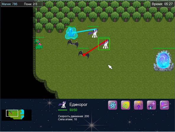 Управление описано в стартовом окне, оно классическое - ЛКМ на действие, ПКМ на перемещение. Самая большая недоработка - отсутствие группового выделения, да, это крайне неудобно, но не осилил в разумный срок. Сейчас управление только по одному единорогу.