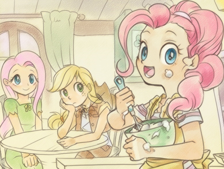 Рядом с ней старина Гранни Смит нетерпеливо поглядывала на пузатую бутылку яблочного бренди. Скуталу скучающе смотрела в магический экран своего мини-кристалла, её подруга Свити Белль пыталась справиться с сильной икотой — от попыток задержать дыхание она вся покраснела и запыхалась.