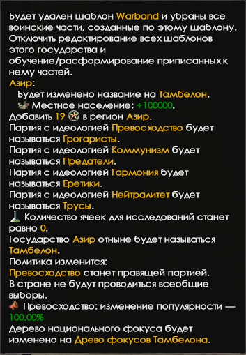 >>4430875 Пупупу, ну и вопрос. И вопрос хороший, у мира еава с точки зрения философии нет иного варианта, кроме глобального объединения. Я вот всегда крашу карту, но мне и ивенты не нужны для этого, я в голове обыгрываю. Хм, о, вспомнил. В Азире(центр зебрики) есть секретный путь козла грогара, или как его зовут. Там тоже покрас мира, вроде. Как его привести - уж не ебу, там как-то по ивентам. О, во как: https://equestria-at-war.fandom.com/ru/wiki/Азир/Тамбелон Ещё есть путь сирен в гиппогрифии. Там надо полное доминирование морских пони, провести гэбней исследования во впадине и культистам помогать, как-то так. Разберёшься, там не сложно. Ещё Кирия гармонистов(при удачной модернизации) может зачистить континент от непозитивных, а так как через северную зебрику в него могут влезть и грифоны(абиссиния и винггарден) и пони(хироптера), то это может привести к завоеванию мира.