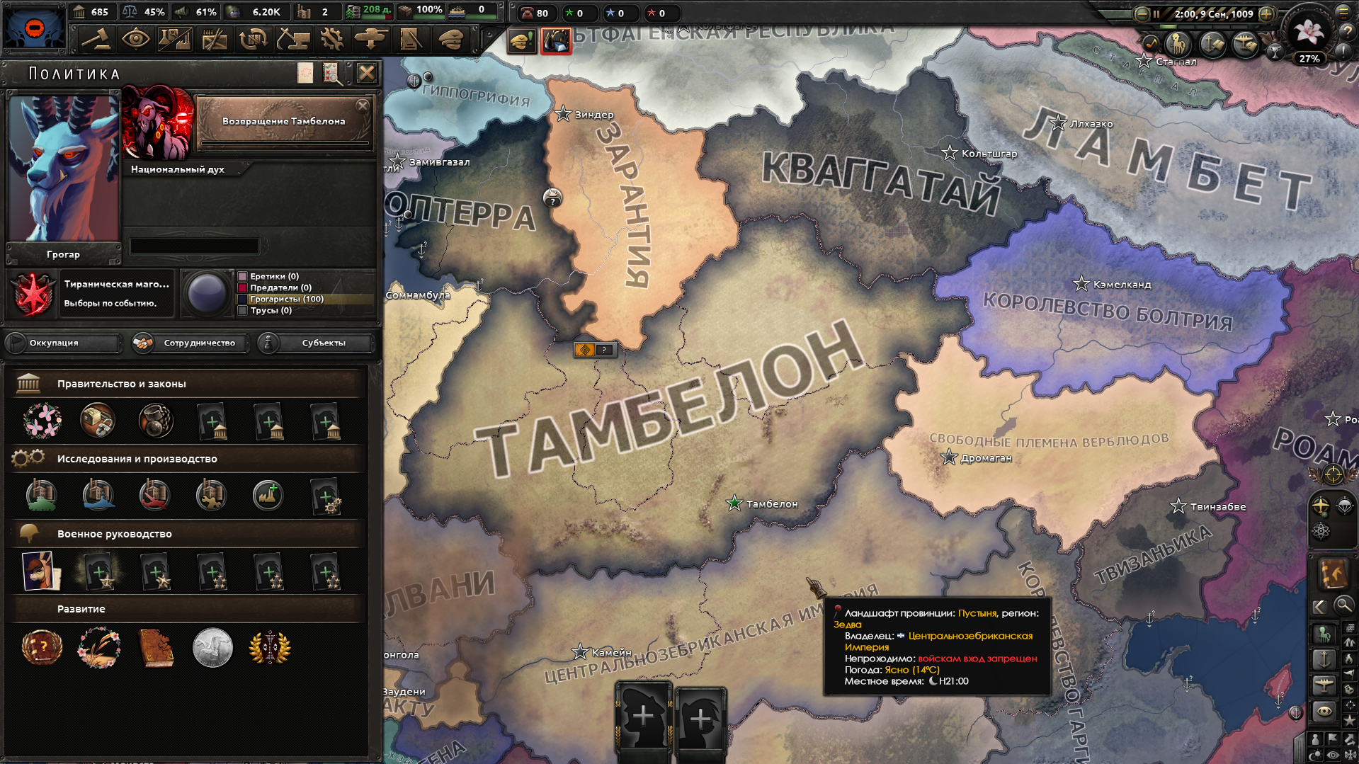 Вкачиваешь Виттенланд по гармонической ветке, образовываешь Речной Союз, но чёртов Озерград, сраная Нимбусия и всратая Баккара шлют тебя нахуй. Запоминаешь это, раскачиваешь военку, клепаешь дивизии, под шумок удаётся опиздюлить соседских грифонов. И вот ты готов раздавать пиздов всем вокруг... А низзя - вокруг тебя только такие же как ты ебаные гармонисты без вклада в мировую напряжённость, выход к морю только через ровно одну провинцию, флота нет, фокусов на опиздюливание тоже нет. Максимум - можно залупнуццо на ИМПЕРИЮ, но чот шибко очково. А нехер было all random на поведение стран при старте выставлять.