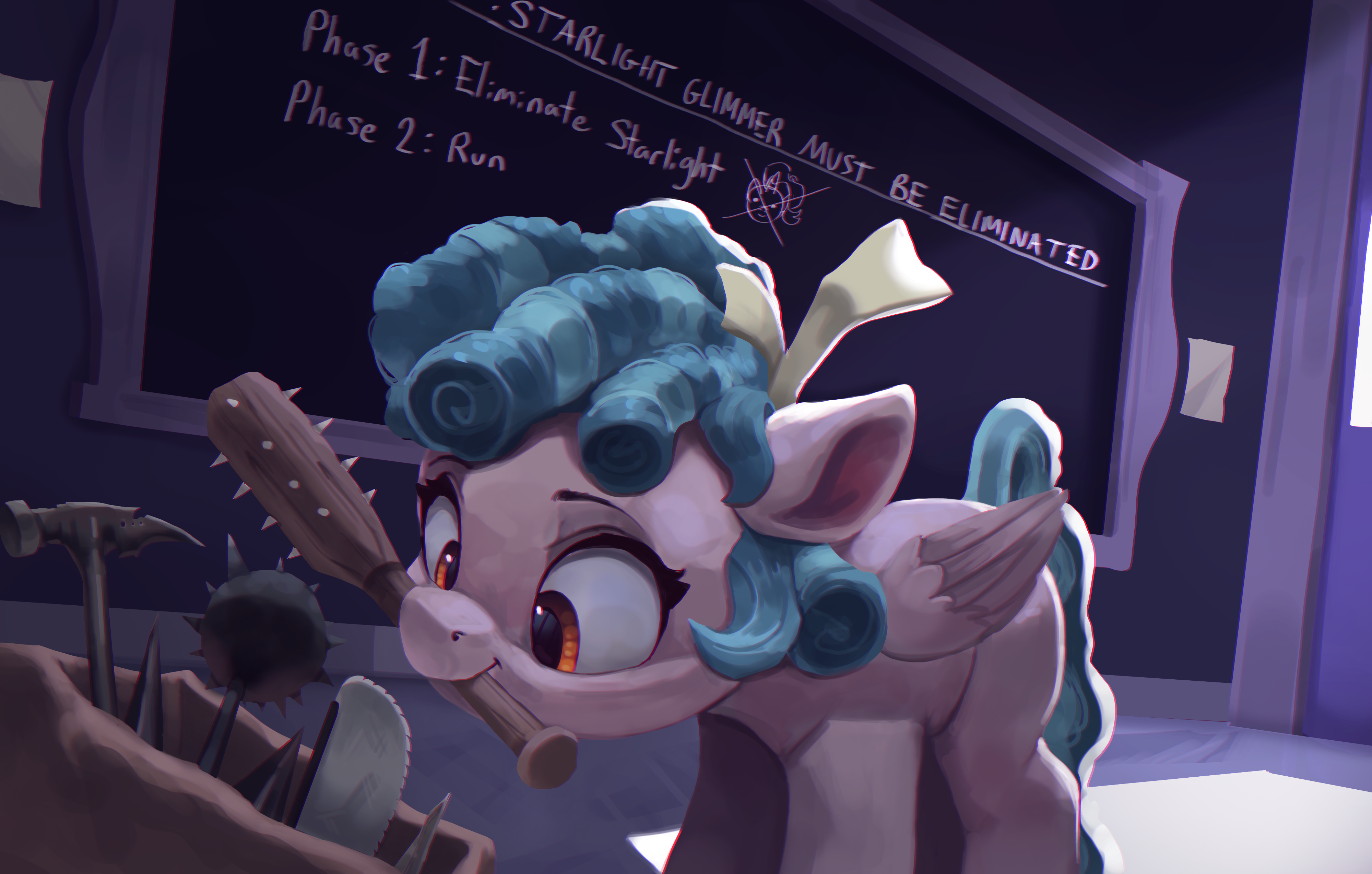 А вообще вместо М6 лучше бы для разноообразия взяли например сюжетных временных или постоянных злючек. Кризалис, Кози Глоу, Темпест Шадоу, Гильда... (Найтмар Мун или Старлайт Глиммер это слишком просто и неинтересно) Та же Кризалис может выебать во все дырки не хуже жеребца, если попросить или сама захочет.