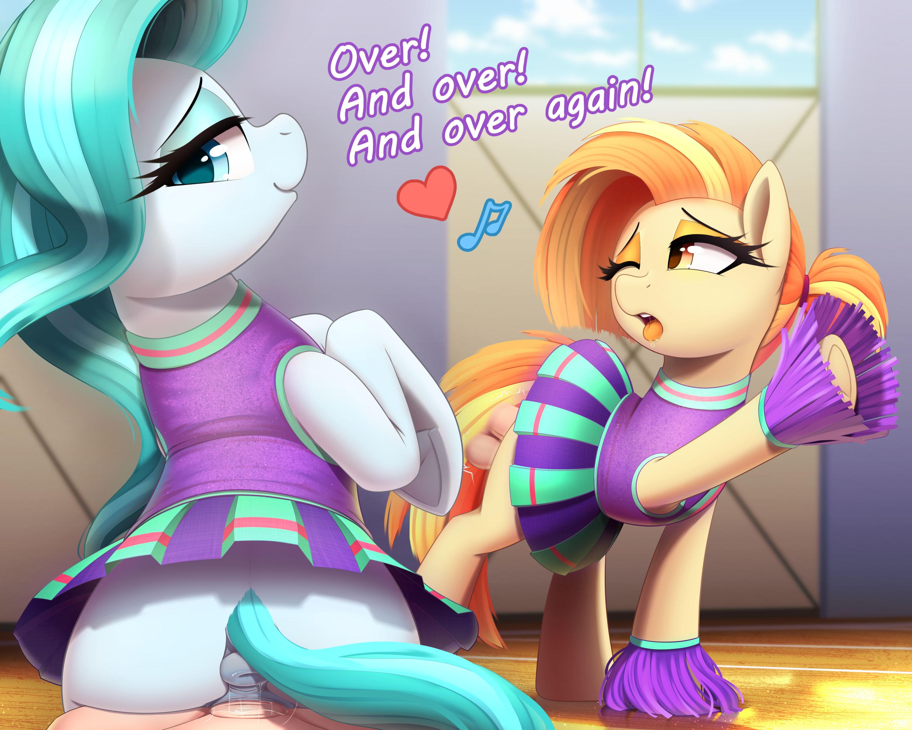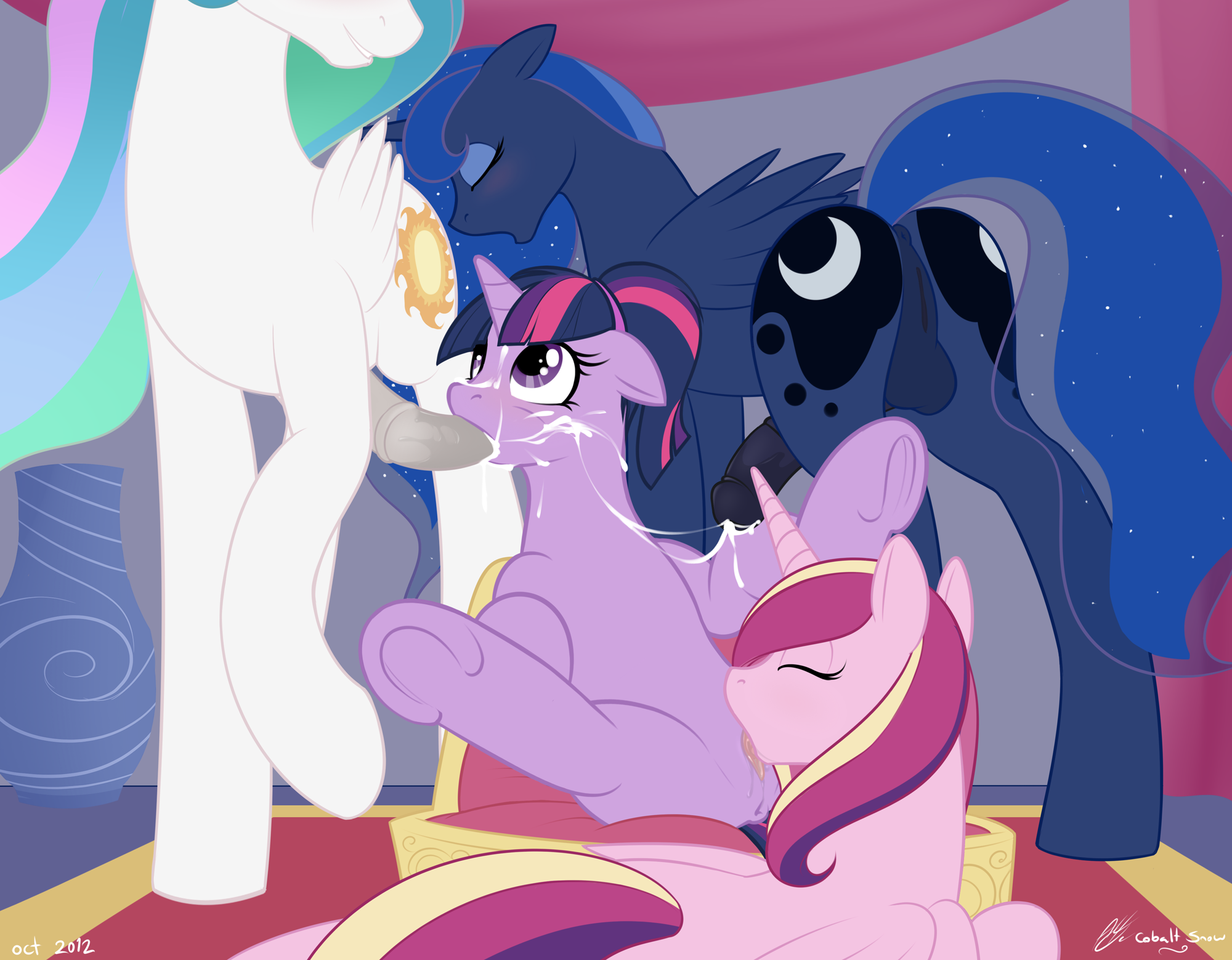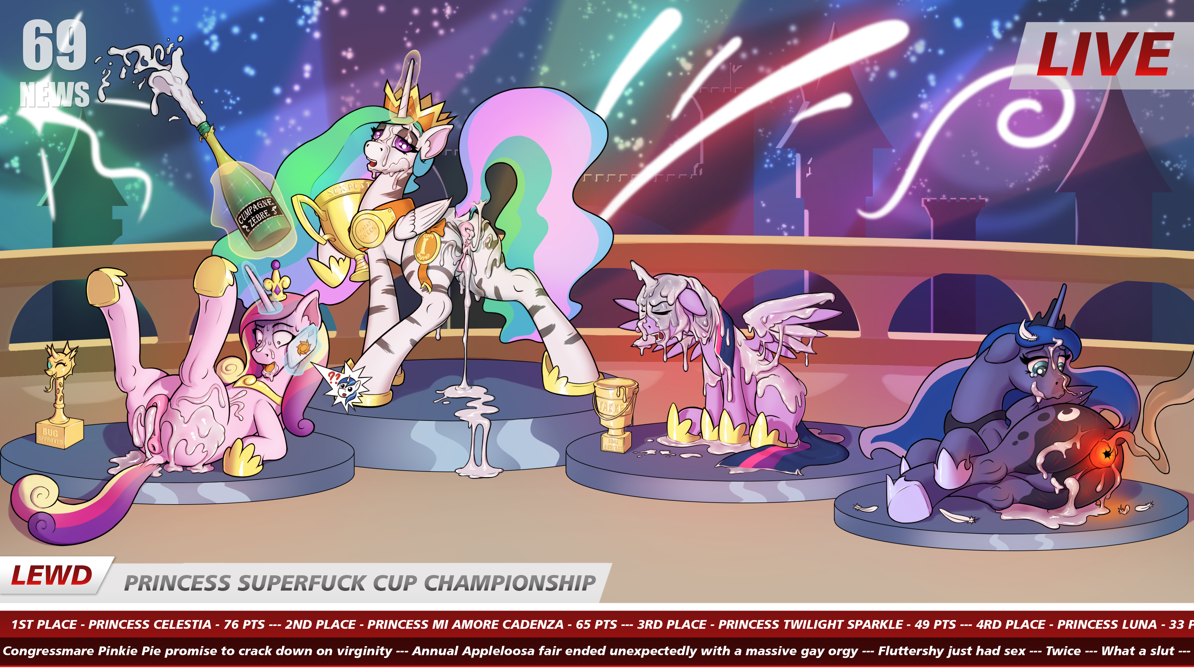 Как всегда, победа досталась непобедимой чемпионке, принцессе Селестии, которая приняла участие во множестве пикантных трюков, главным из которых стала самая масштабная в истории групповая оргия в полоску. Принцесса Ми Аморе Каденца занимает второе место с большим отрывом. Ее впечатляющее выступление с целой толпой оборотней принесло ей необходимые очки, чтобы оторваться от 3-го и 4-го мест соответственно (бонусные очки за измену мужу оказались решающими). Принцесса Твайлайт Спаркл, «тёмная лошадка» нынешнего чемпионата, применила все свои магические навыки в самых… шокирующих видах секса. Щупальца, похотливые призраки, проглатывание большого количества белого зелья — всё это позволило ей составить конкуренцию своей главной сопернице, принцессе Луне, но очки за 3-е место были заработаны в букаке-сессии с «Синими яйцами», известной командой по минету из Якьякистана. И наконец, самое главное, четвертое место досталось вечно не оправдывающей ожиданий принцессе Луне. Удачный старт с БДСМ-сессией с лесбийской командой из Грифонстоуна временно вывел ее на первое место, но захватывающее испытание с драконьими спортсменками оказалось слишком амбициозной целью для принцессы ночи, что, как и следовало ожидать, привело к ее четвертому месту.