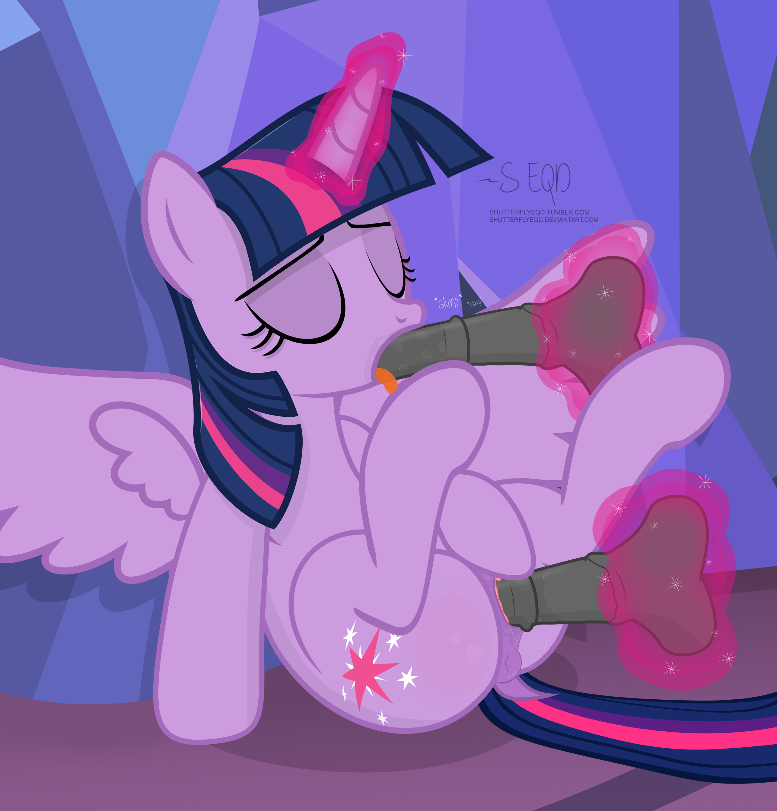 > Конечно хотел бы. Я хочу Твайлат. Она мне интинтересна. Мне нахуй не нужны крылья, я просто ее хочу в ее дубе-бибилиотеке, в ее постельке со звездочами Тавайлайт, пожалуй, наиболее интересный вариант для отношений. У М6 и не только вообще нету сексуального опыта. То есть у Старлайт, Трикси, Лайры, Бон-Бон и так далее. Это делает поней только еще более желанными. Это уже у семейных поней в сериале, да и у Тии с Луной можно думать что опыт был в каком-то количестве.