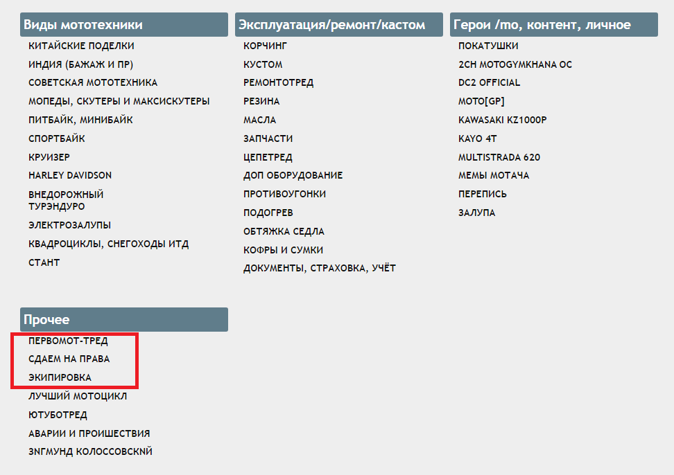Дерейлинг тематики и/или общение, в т.ч срач не по теме выбора мотоцикла, включая участие в нерелейтед-обсуждении, начатом другими. Исключение - обоснование из практики дорожного движения рекомендуемых/обсуждаемых технических параметров