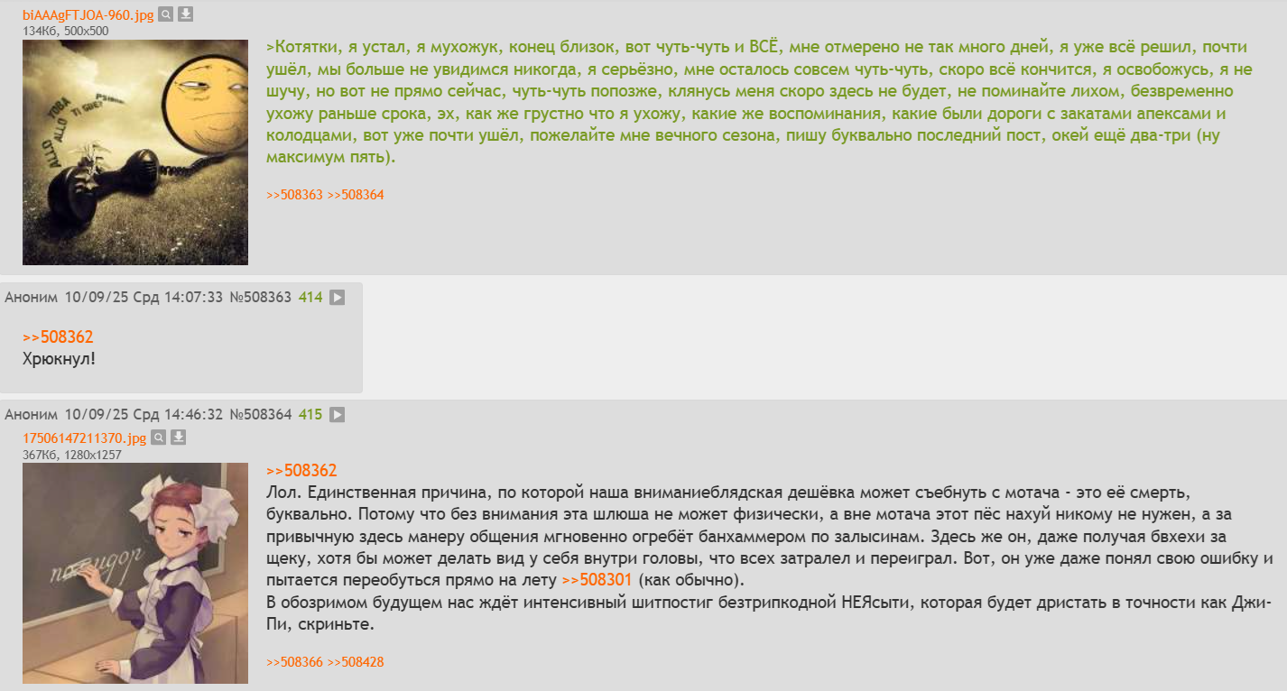 Новости сентября: Главпидор загадочно и трогательно прощался с мотоциклизмом, наклюкавшись нефильтрованного пшеничного шнапса, но потом проспался, одумался и ужасунлся. Мотач соревнуется в оригинальности, трактуя сии откровения, а Андрюша уже третьи сутки непрерывно вахтёрит оправдывается, раскрутив свою жопу до абсолютно рекордных оборотов и всё отрицая.